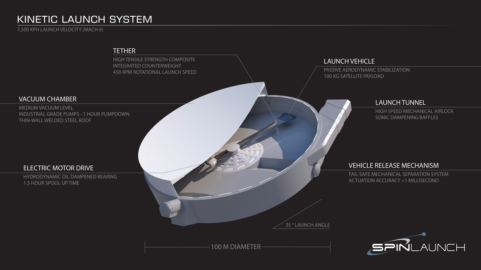 The process is known as "kinetic launching" and utilizes a huge electric motor-powered centrifuge called the Suborbital Accelerator, which looks kind of like a turbocharger the size of the Statue of Liberty.