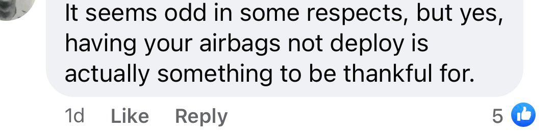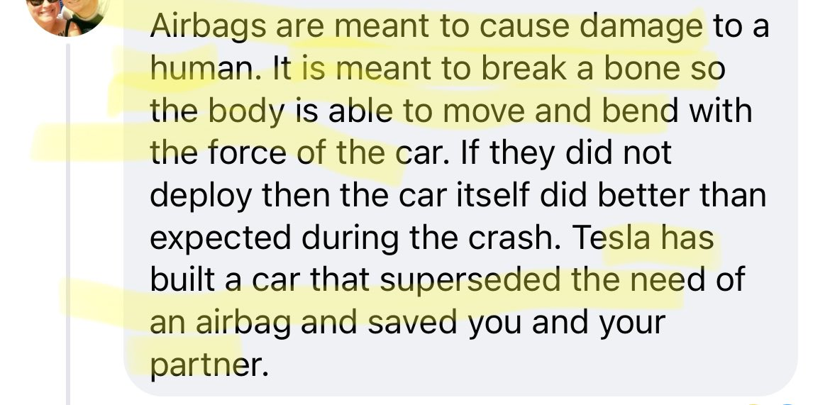 While we all know of the weird nerds desperate to defend Elon Musk and Tesla, no road car is so great as to entirely forego the need for airbags. They're an important part of a car's safety infrastructure, and they need to work properly. Whether they did in this case is a good question to ask, but these sorts of cultish responses don't add anything valuable to the conversation.