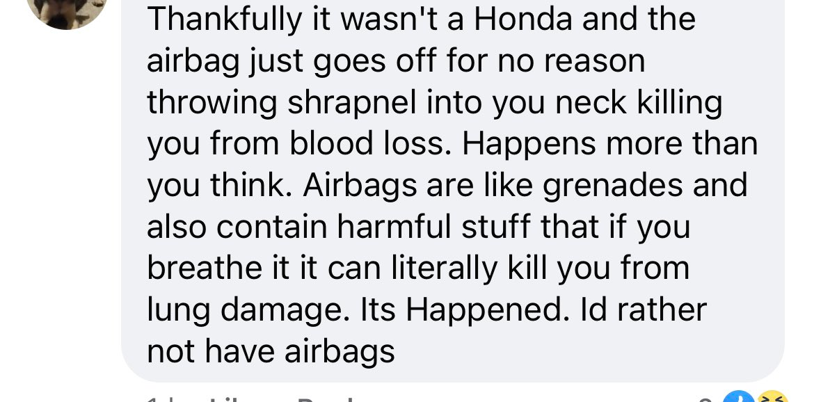 The last screenshotted comment, though, is truly the pièce de résistance. "Airbags are meant to cause damage to a human" is the kind of conspiracy theory I love — the kind that can be disproven instantly. Hook it to my veins.
