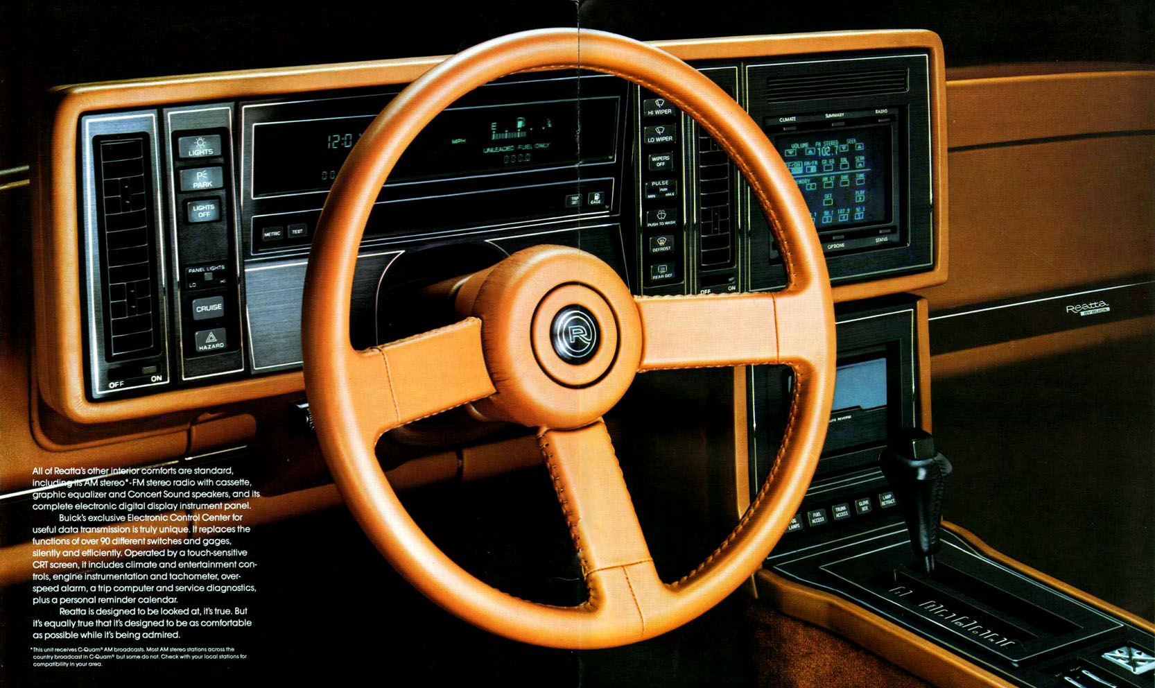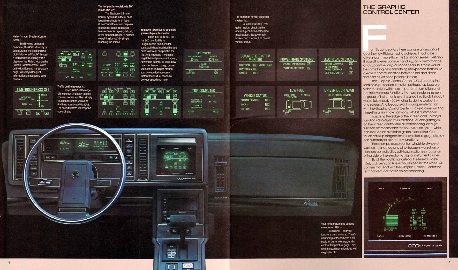 Buick called the system the Graphic Control Center or GCC. One hundred Riviera prototypes were fitted with the screens and taken to dealers around the country so they could familiarize themselves with the system. By 1986 it was available for all buyers in the Riviera.