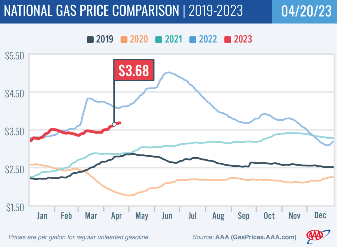 Welcome back to Gas Price Watch! It's been a long few months since we last talked about this, but what day is better than 4/20 to bring gas back into the conversation? Prices have been climbing in the wrong [read: rising or more expensive] direction for a while now – pretty much since the end of 2022. According to AAA's trusty gas price tracker, the average price for a gallon of regular fuel is currently sitting at $3.68, which is actually up five cents from just a week ago. Luckily for us though, it looks like that trend may be changing.