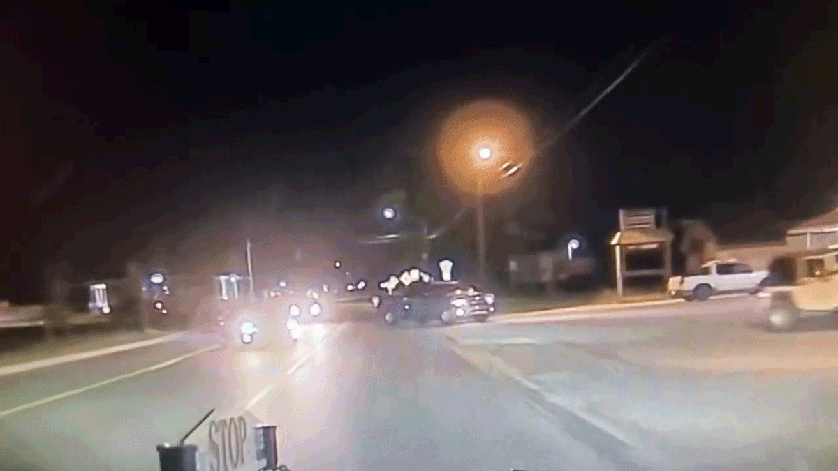 Dashcam footage shows the aging sedan almost hitting the cruiser head-on before slamming into a parked car refueling at a gas pump. Don't worry. The Pontiac couldn't have been going faster than ten miles per hour when it made impact.
