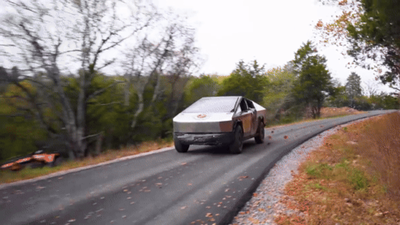 The team repairs the shredded CV axle and then sets off on a hauling challenge, which loads both the F-150 and Cybertruck up with around 3,000 lbs of cinder blocks. The Ford loses its driveshaft while hauling the load, and the Cybertruck clatters over a jump and loses a rear wheel.