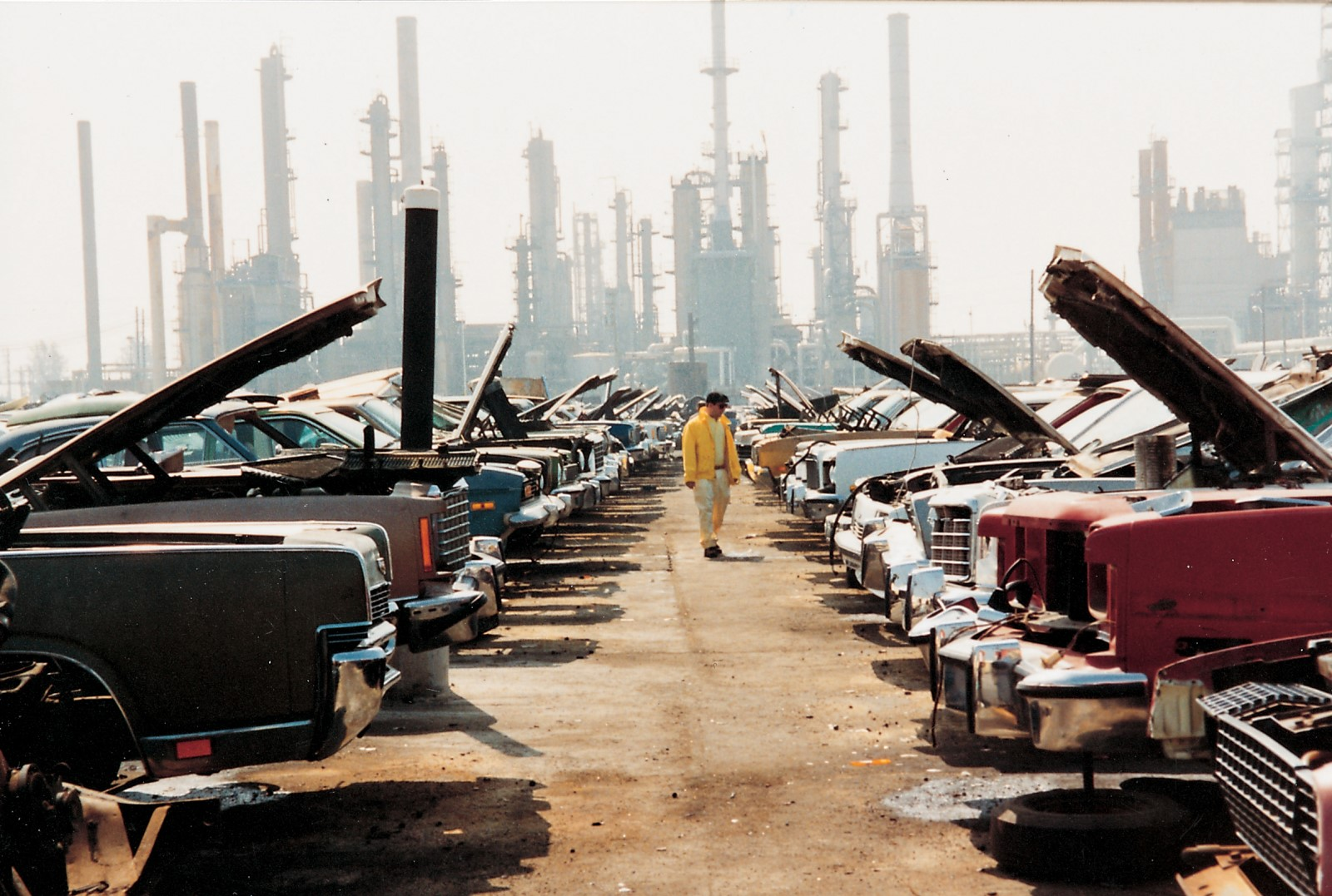 Rhoades was into cars as metaphors, according to Schaffner. His final MFA project at UCLA involved racing a small fake Ferrari around a cardboard track while wearing a racing suit of his own design, a way of demonstrating "competition and his plan to leave art school a winner," she says. His work racing mini-bikes around the cement bed of a drained amusement park monkey island was, according to Schaffner, about "experiencing the speed of camaraderie." His miniature car race at Willow Springs, where car-mounted-cameras captured photos of the drivers that he printed and attached to the vehicles during the race, was, Schaffner says, about "the car as a kind of image-making machine."