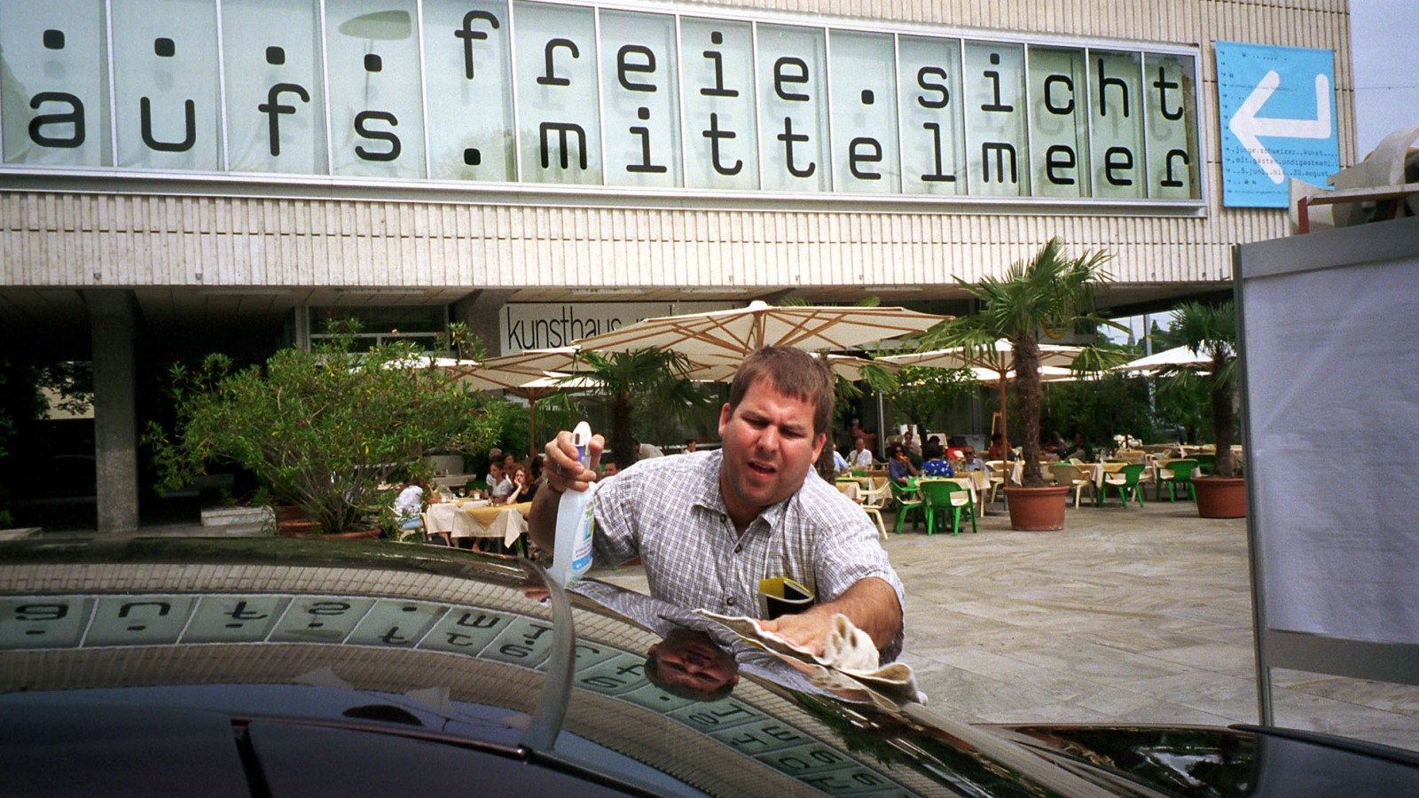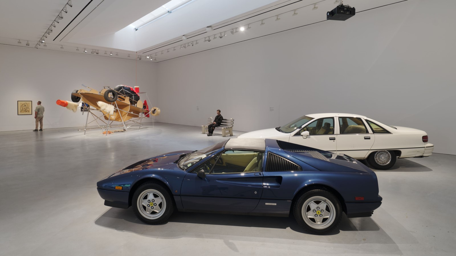 The five vehicles in this New York exhibit had all had roles in other Rhoades art projects. The Fiero had been part of Rhoades' 1994 ersatz Ikea installation "Swedish Erotica and Fiero Parts," explaining its mild Swedish yellow palette. He transformed a white French 1989 Liger Optima micro-car into an intimate social space for his 1997 installation "Conversation Car." A burgundy 1996 Impala SS had been parked in the plaza of the Kunsthaus in Zurich, Switzerland for his 1998 piece "International Museum Project about Leaving and Arriving." A white ex-law enforcement 1992 Chevrolet Caprice Classic had been part of a French exhibition in 1996 called "Traffic." Then, there was the blue 1989 Ferrari 328 GTS.