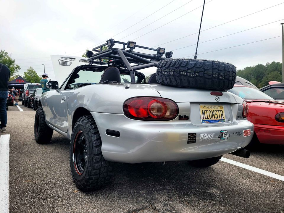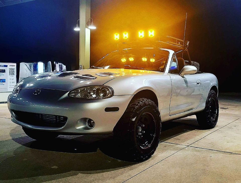 Today's 2005 Mazda Miata Sorta-Safari has both of these questions covered. Raised on a three-inch lift, reconfigured suspension, and chunky big tires, it's gone from a low-slung sports car to a stream-wading soft-roader. Add to that some hood vents, a custom carry-all cage above the soft top, and a rearview impacting spare on the boot lid, and it had the looks to go with that implied function.