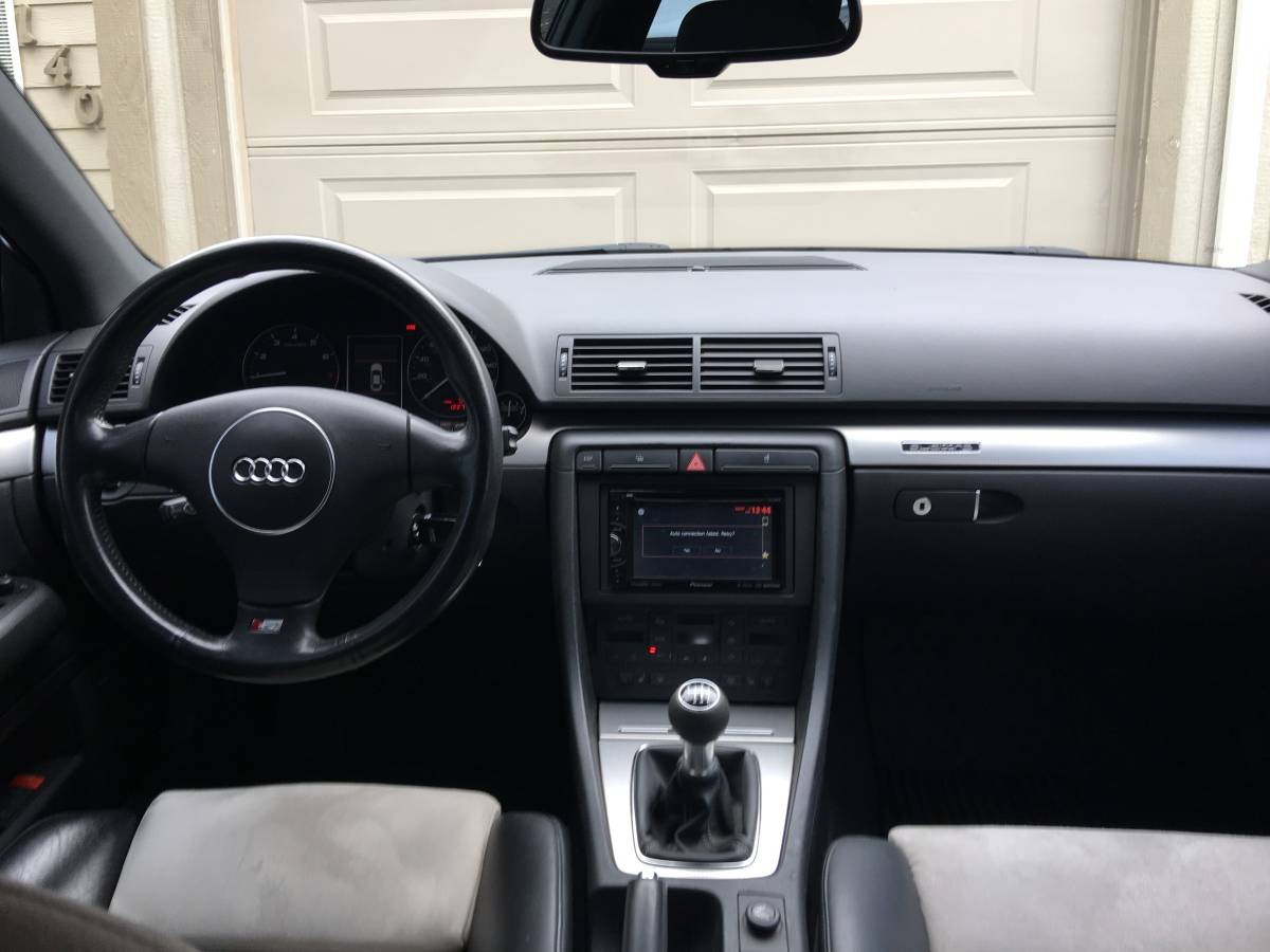 The interior features the standard S4 sport buckets up front and contoured bench in the back. It's all upholstered in two-tone black and white, with leather outers and suede center sections. Marring the overall aesthetic a bit are a worn headlamp switch bezel and an aftermarket double-DIN head unit. Other than that, it looks ready to rock.