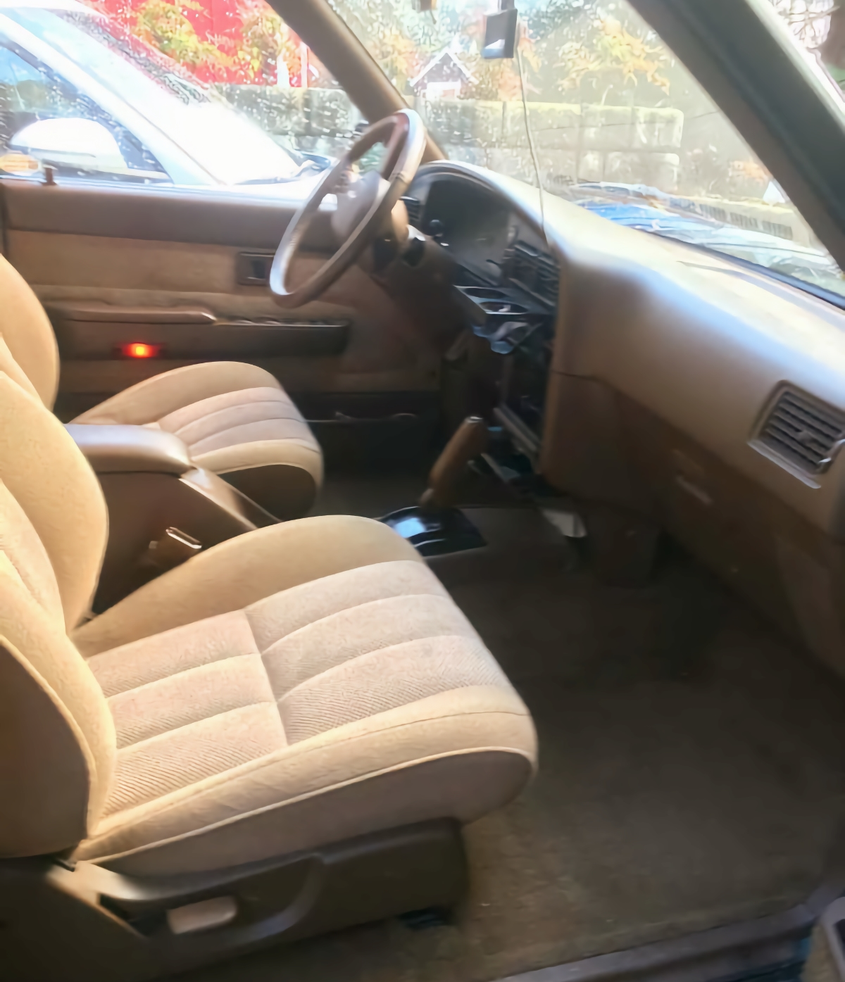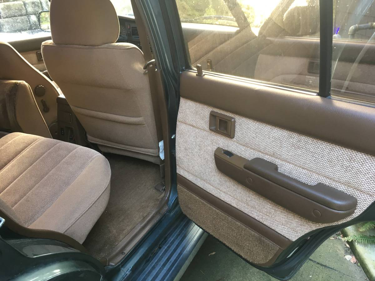 The paint is that dark metallic gray that Toyota liked in the '90s. That's matched with a set of factory alloy wheels, full-length running boards, and a swing-out carrier for the externally-mounted spare. There appears to be no noticeable issue with the paint, the bodywork beneath, or the modest amount of chrome trim that festoons the truck. For a 4X4 that's intended for extended stays in the bush, it all appears quite posh both on the outside as well as in the beige cloth-upholstered interior.