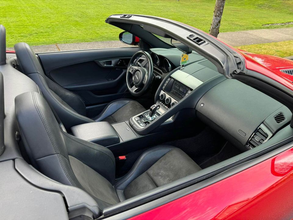 It doesn't look bad either. The Jag's lithe lines suit the Caldera Red top coat well. The factory alloys help, too, and appear unscathed of any curb encounters. The tight-fitting cabin has leather and Alcantara seating surfaces and a cartoon bear air freshener that probably doesn't offer much when the top is lowered. Everything here looks to be in decent condition, with no apparent rips, gouges, or tears. And yes, there are center air vents. They pop out of the top of the dash.