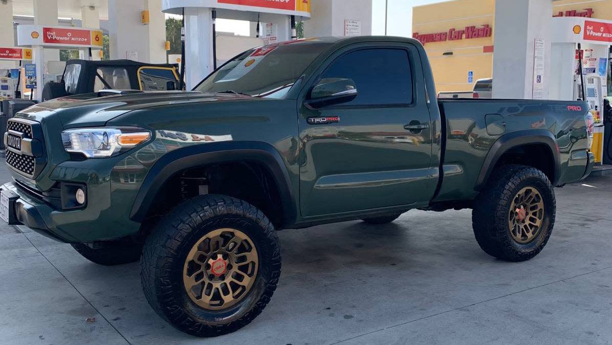 The truck is said to run the front clip and bed off of a 2018, with custom fabricated door skins to tie those both together. The whole thing rides on a 4X2 chassis with an unmodified 2.7-litre/five-speed drivetrain. That's all been jacked up on a four-inch lift and rolls on 17-inch TRD alloys wrapped in Nitto knobbies.