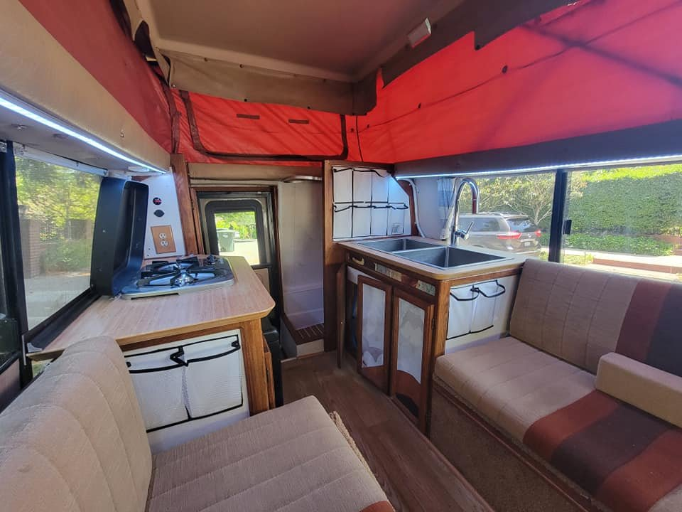 All the upholstery appears to be intact and shows minimal wear and no fading. The bamboo countertops and table top are clean and the fabric of the pop-top appears complete all around. Up in the cab, there's matching upholstery on the sport bucket seats and a modern stereo with a big touchscreen that doubles as the backup camera's display. A few cracks in the dash cap spoil the party a bit, but that's to be expected and a minimal price to pay for the truck's age.