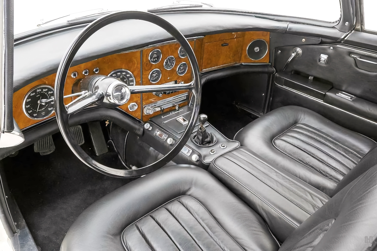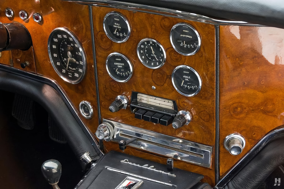 That transmission is shifted via a short tunnel-mounted lever that is canted towards the driver. That sits center in a cabin awash in black Vaumol leather upholstery that extends to the doors and dash surround. The black leather is paired with some elegant burlwood across the dash. Showing just how low this car really is, the steering column sprouts from the center of that dashboard, not from beneath. A full set of Jaeger gauges accompany it, as does a period-correct stereo. Everything in the cabin looks to be in terrific shape with only minor flaws observable in the welting and leather substrate.
