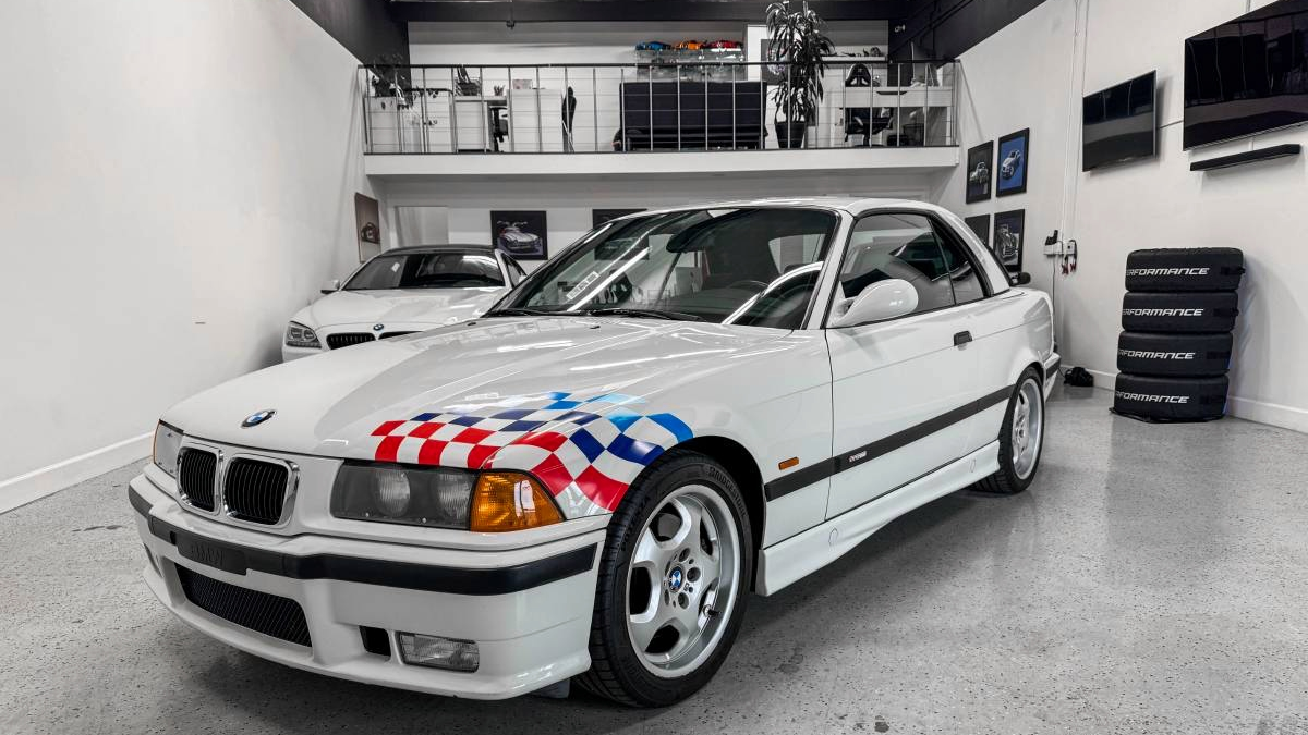 Aesthetically, the car presents laudably well. The Alpine White paint is not the best color for the car, but, as they say in the Hamptons, it goes with everything. Accenting that pale paint are checkered flag decals on contrasting corners, replicating the look of the E36 Lightweight. This being a convertible with a hard top, it's not lightweight. Factory Style 23 alloys underpin and look perfectly sized for the car.