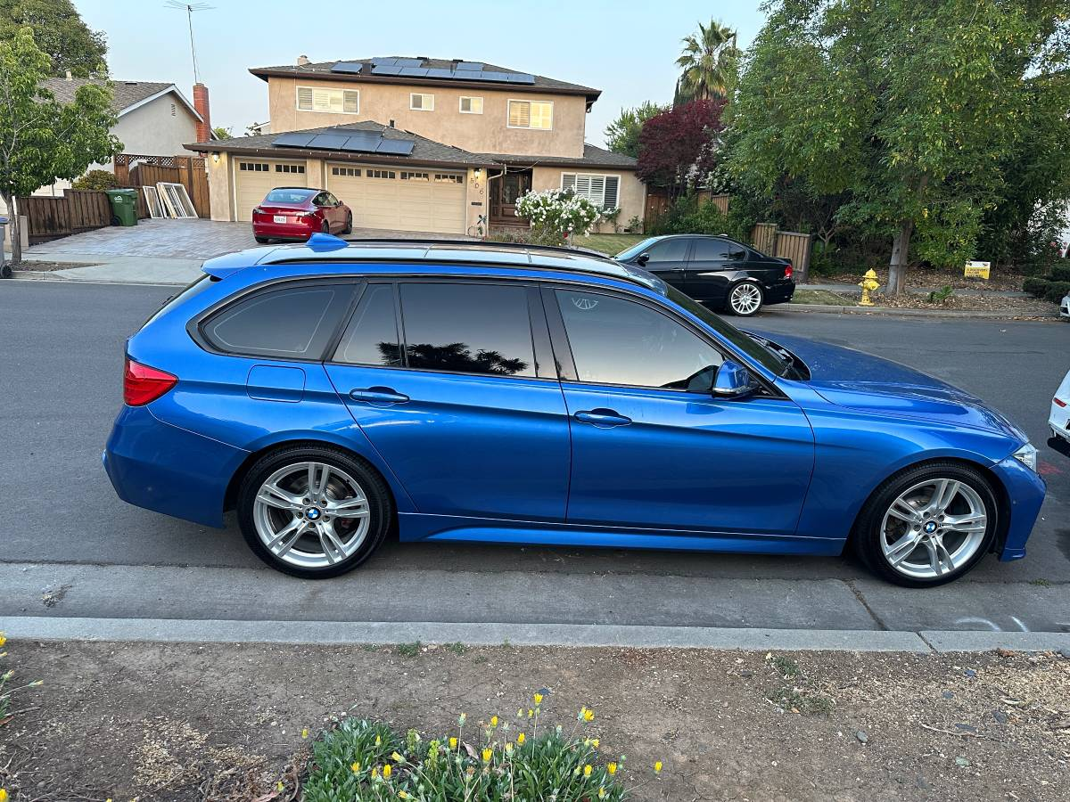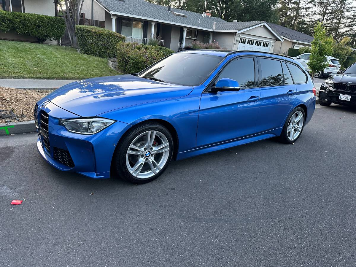 It's a pretty nice picture, too. The Superman color scheme may not sound right, but overall, it looks excellent in the pictures. The aesthetics have had a good bit of massaging to go along with the mechanicals. The nose is aftermarket and modeled after the later G80 M3, featuring that car's exaggerated twin kidneys between the F30 headlamps. It's been color-matched and gives the wagon quite a unique appearance.