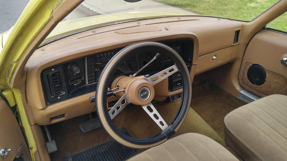 The interior is complete but somewhat hard-worn. The seats are alarmingly flat both front and rear, but you need to realize that the car was never intended, nor capable of the kind of heroics that would warrant cosseting passenger containment with extensive bolstering. A three-spoke sport wheel heads up a GM-sourced tilt column with the shifter for the three-speed slushbox.