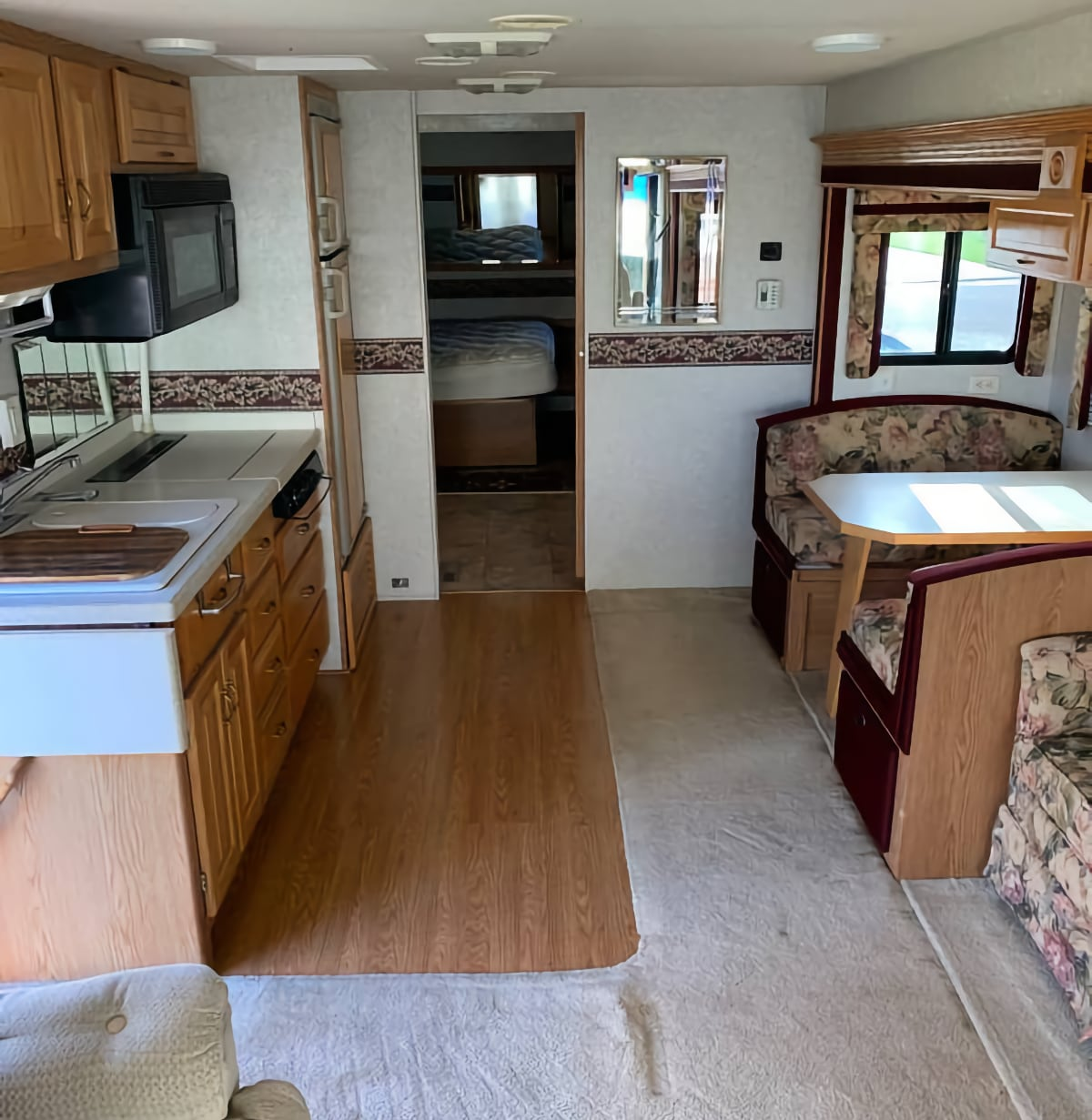 Inside that space, you'll find recliners and couches and captain's chairs, all in original detailing that the seller claims to be in excellent condition. If you've ever been to a Cracker Barrel or Nebraska Furniture Mart then you'll feel right at home with the decor.