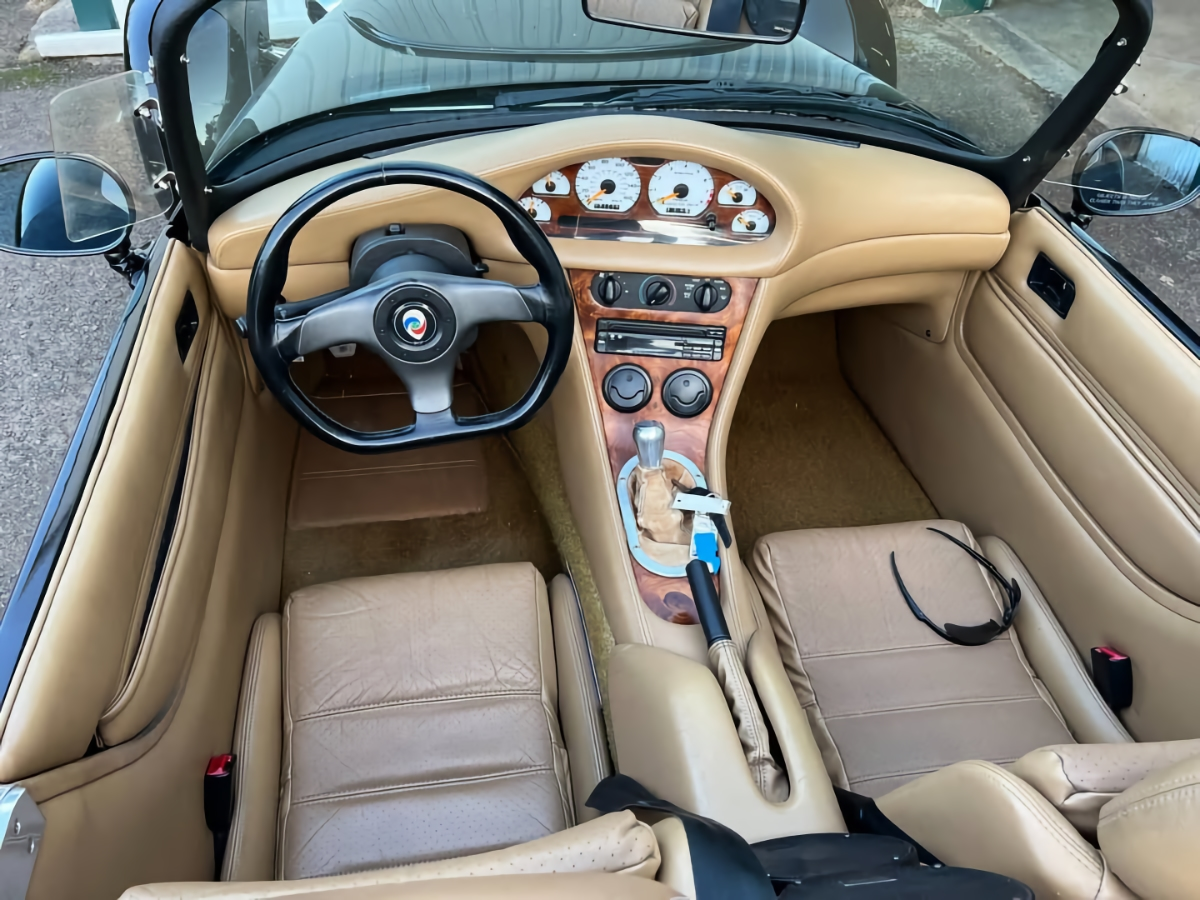 There's not all that much else to the car, really. The cabin is accessed by two small doors that sit atop raised gunwales and bracket a pair of narrow seats and an appreciably wide center tunnel. More Mustang bits can be found here, including the instrument cluster, which has been shifted to a driver-oriented position in the center of the dash. That sits above the standard Ford HVAC controls and a pair of off-the-shelf air vents. There are no airbags, as the Roadster's limited production numbers allowed Panoz to dodge that requirement, but there are seatbelts. Those pull out from the car's center, buckling on the outside in reverse fashion from the norm. In total, 176 AIV Roadsters were sold, making this car a substantially rare opportunity.