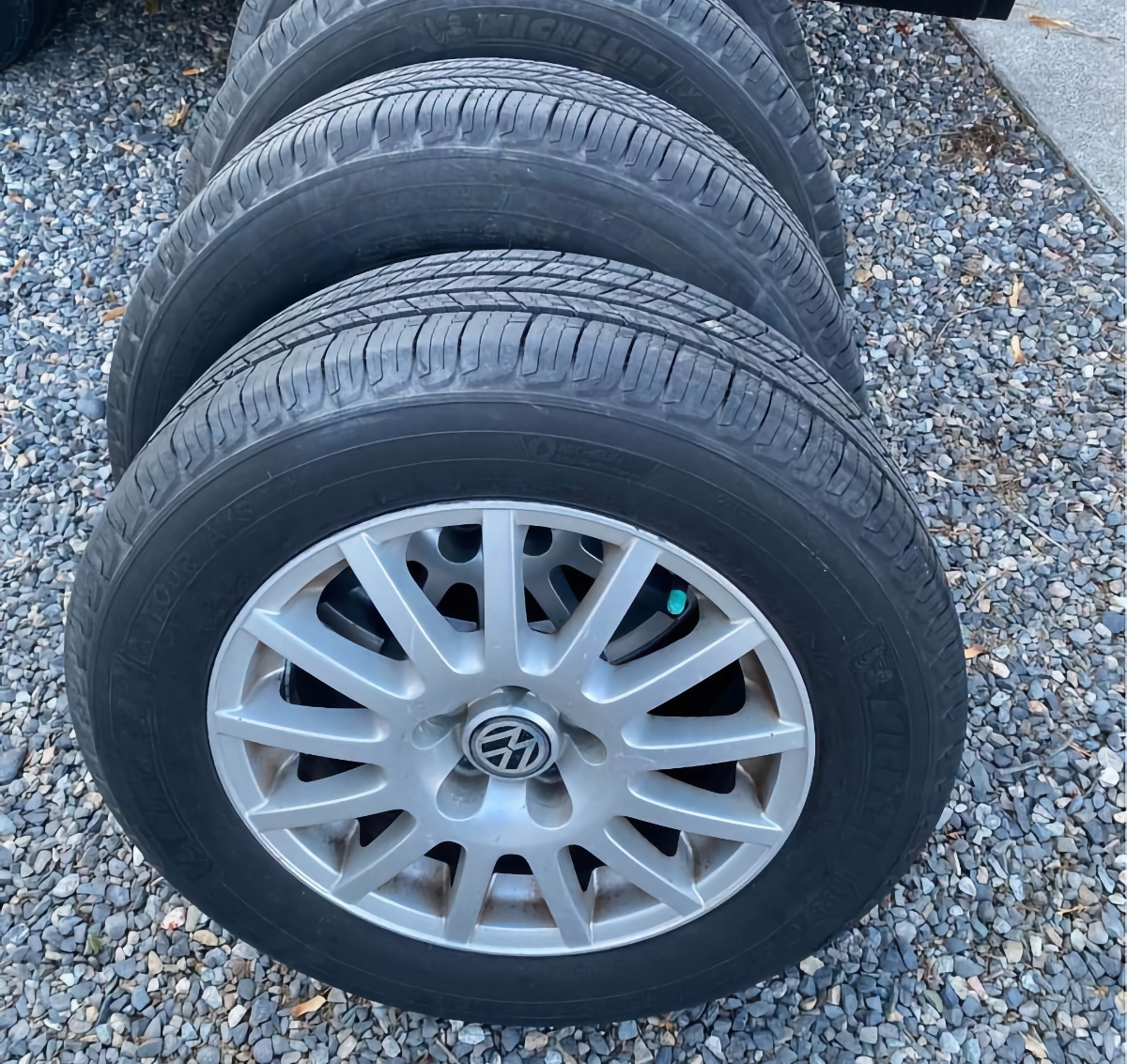 Obviously, those are comically large for the car and require spacers and plastic arch extenders to even fit without rub-a-dub-dubbing the tires on wheel wells. The seller says purchasing the car in this state will take an additional $500 over the asking price. If demurred, the car will come with VW's standard alloys, as shown. I vote to go with the stock wheels and no spacers.