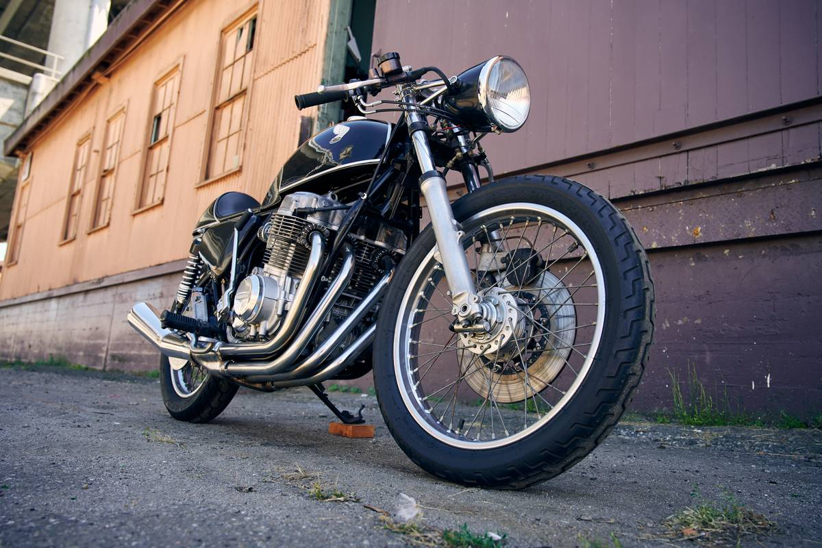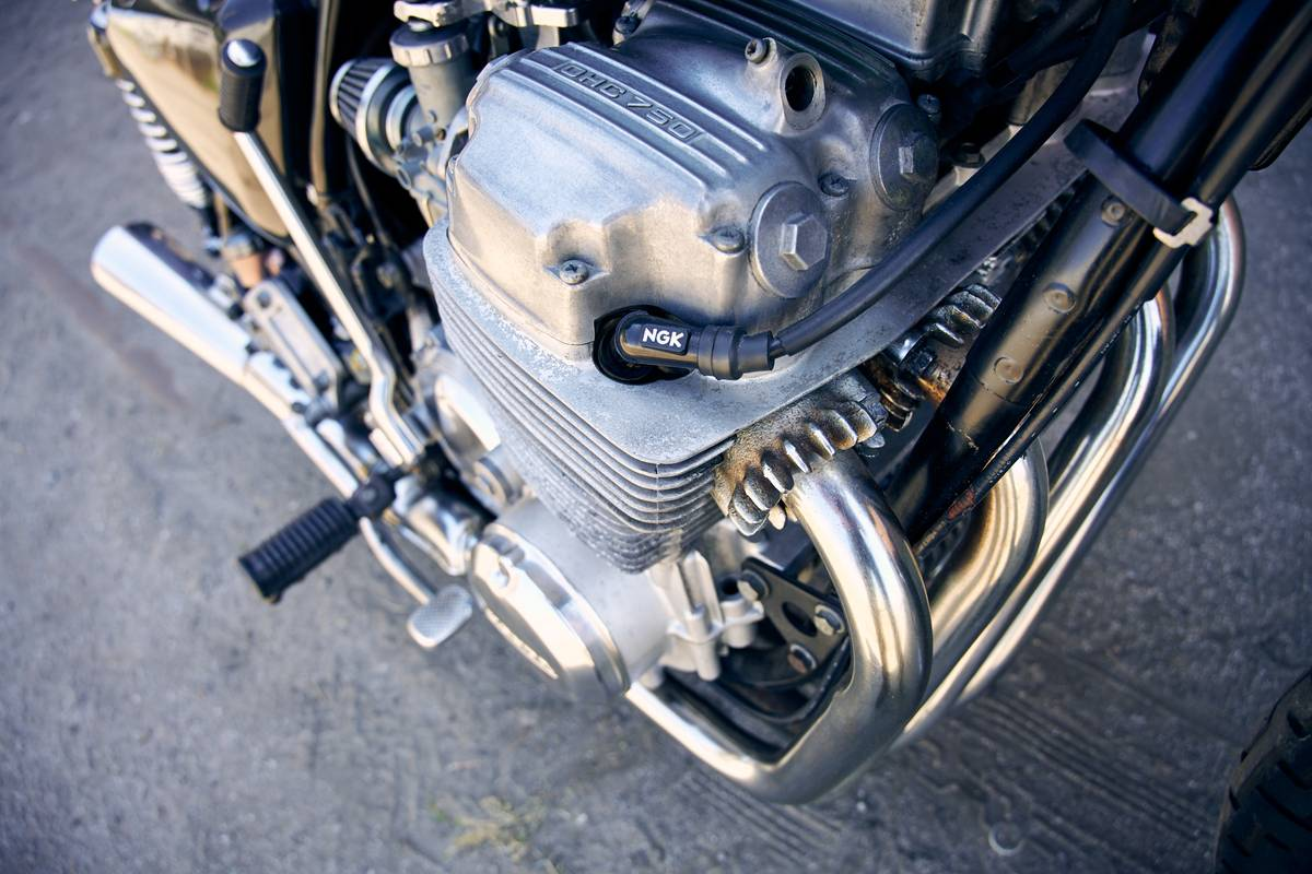 This one carries what looks to be a stock frame and era-appropriate—meaning Billy Joel tie skinny—wheels and tires. The 736cc SOHC inline four breathes through a quartet of Keihin side-draught carbs, as they should. These use the pair of lifting arms for throttle actuation. Other models used a four-into-one cable arrangement. The airbox has been given the heave-ho, with air-cleaning duties now handled by a set of individual cone filters.