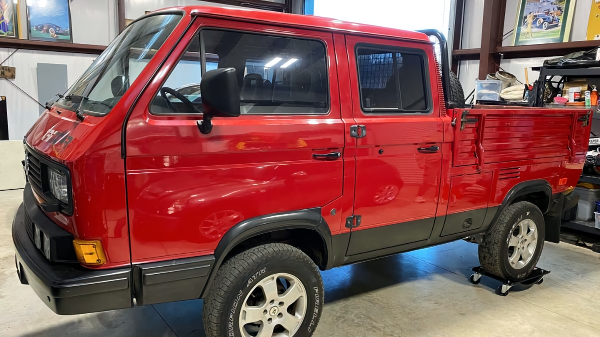 Let's move on from half-baked projects to some formerly forbidden fruit. Today's 1989 Volkswagen T3 Doka Transporter TriStar offers four doors, four-wheel drive, three foldable bedsides, and one under-bed pass-through storage compartment for storing baguettes and skinny kids. I'd say that's a lot. And, while these cult-classic trucks were never officially offered for sale here in the States, this one is claimed to not only be Federally compliant but also to meet California's strict emissions standards.