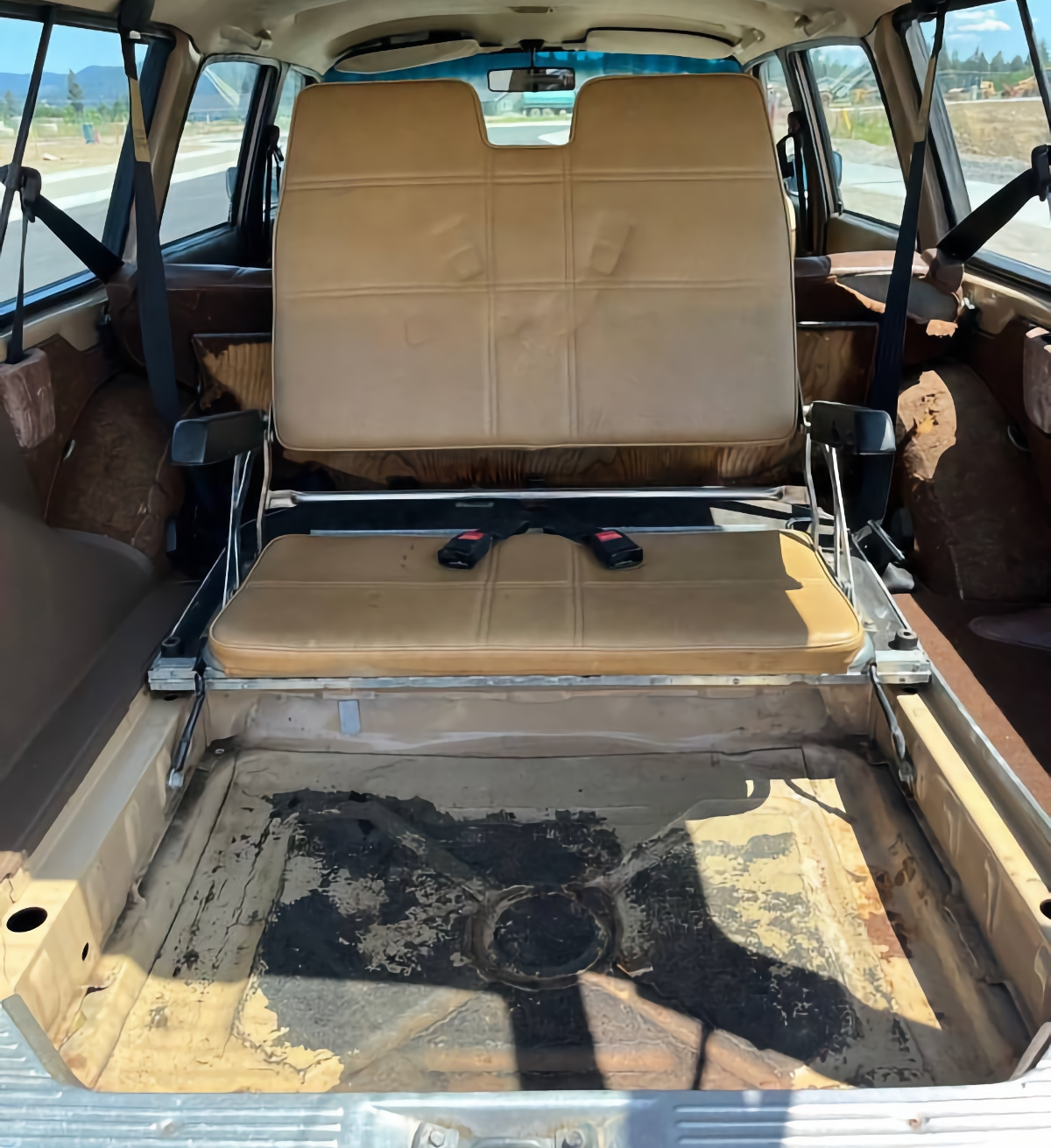 Things are likewise a bit of a mixed bag in the cabin. The cloth front seats don't match the vinyl on the back bench or doors, although the seller claims to have matching upholstery that will come with the car, just not installed. A carpet for the third-row footwell is also included but is in a non-matching color. There's no word on whether the hair tie circling the shift lever is included or not.