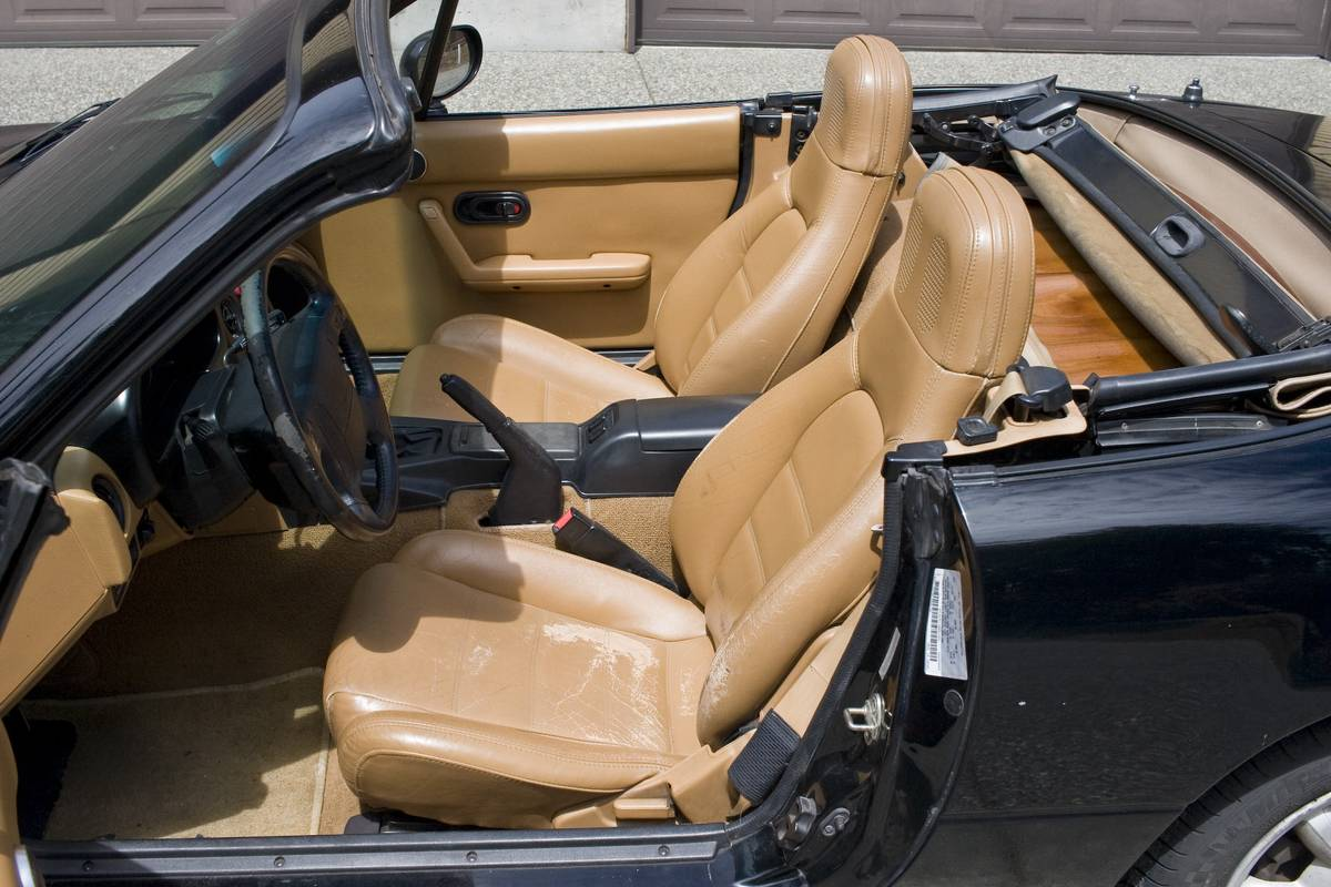 Leather covers all the main tactile surfaces in the cabin, as well as the two sculpted bucket seats. There's a good deal of wear noticeable on the driver's seat and on the steering wheel. None of it seems egregious, but there should be some new upholstery envisioned in this Mazda's future. An aftermarket stereo sends tunes through the stock headrest speakers and some sort of add-on bass box. Other amenities include A/C, cruise control and power windows.