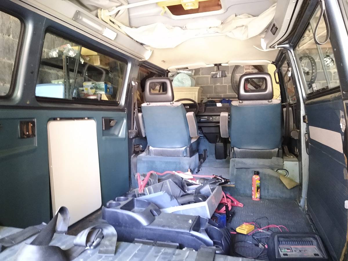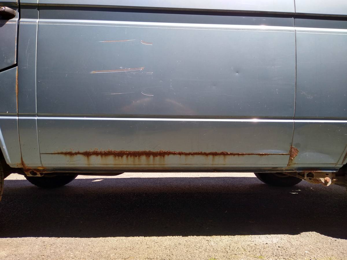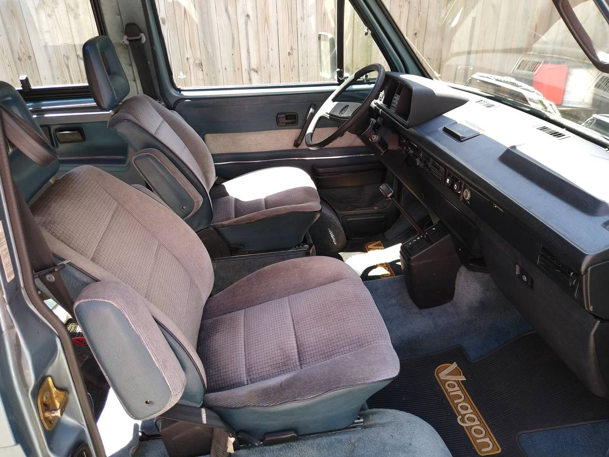 The pop-top works and is intact save for a small tear at the top of the bug screen. That looks like it could easily be repaired with a needle and thread. Below that, the paint is not great, as the clear coat seems to be abandoning ship pretty much across the board. Considering the issues with the bodywork underneath, a respray will most likely be called for anyway. Wheels are VW Carat alloys but those wear tires so old that they fart dust and the seller says they aren't even safe to tow on. That's ok, though, the Vanagon will fit on a flatbed.