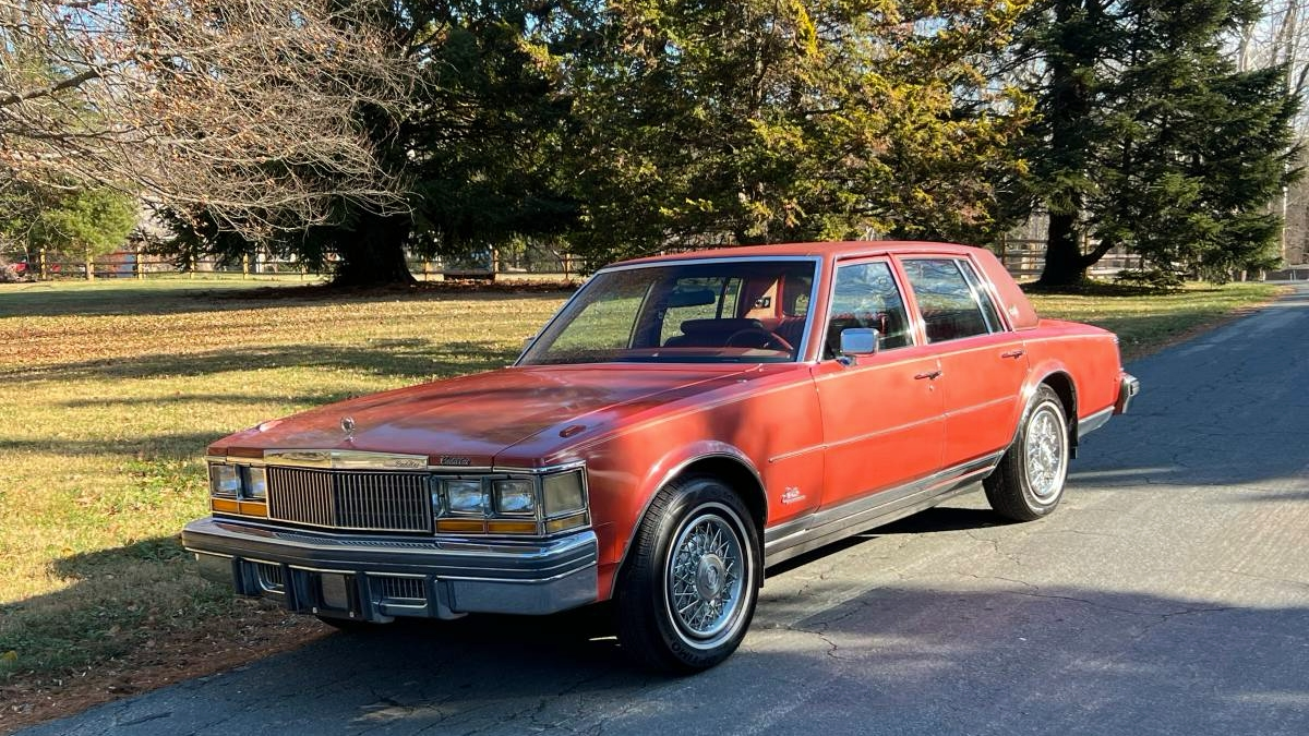 Our Seville, in Firehorn, over a luridly red leather and vinyl interior, still looks as good today as it did upon its debut in America's bicentennial year. There's still enough chrome on the outside and faux wood on the inside to ensure people know this is an American luxury car, but its size and overall look are toned down from other high-end models of the era. One extremely on-point touch is the wheel and tire treatment, consisting of fake wire covers and white sidewall Hankooks.