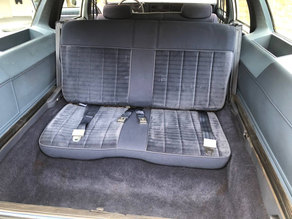 The interior is a glorious sea of color-coded blue velour and plastics with just enough fake wood trim to make you forget its absence on the exterior. Instrumentation is sparse, but you do get factory air and an analog AM/FM stereo. Everything in here, save for the carpet, looks almost as-new. That rug does show some staining in the footwells and around the third row, but it's nothing you couldn't live with.