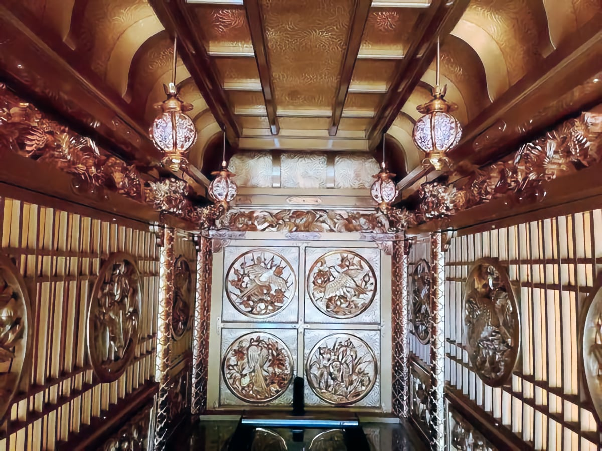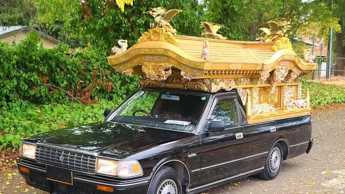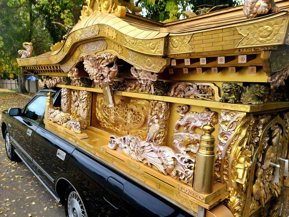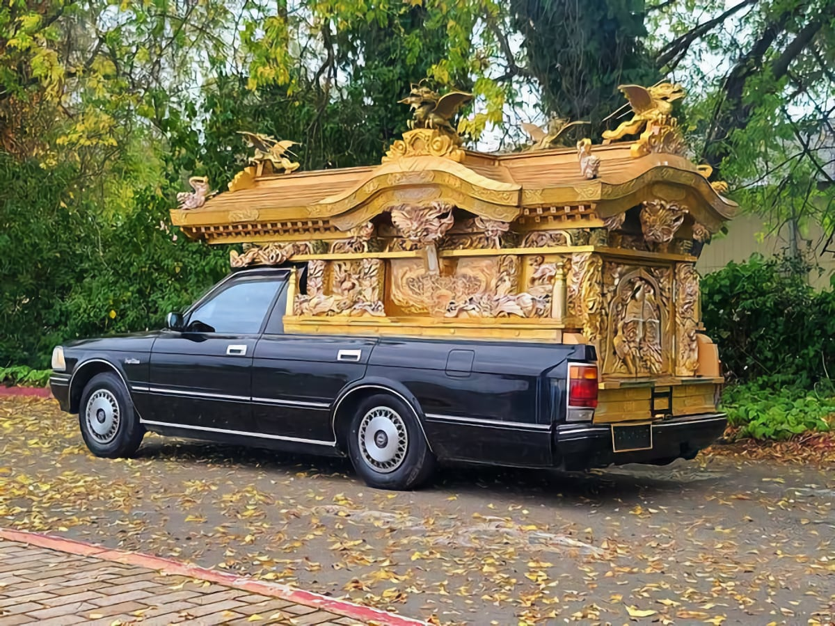The Miyagata, or shrine-shape hearse, is a type of Reikyusha, the purpose of which is to transport the dearly departed from the mortuary to the crematorium. Underneath is a typical hearse, with a coffin slide and lock-downs inside, but around that is built a gilded cap resembling a Shinto shrine. In Japan, the level of the hearse's ornamentation is generally regional, with some areas preferring more subdued styles and others liking to go all-in on going out.
