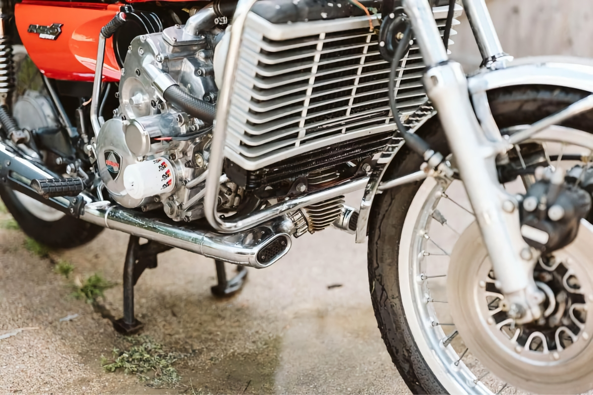 This one, in arresting orange and black stripes, appears to be in excellent shape for its age.Additionally, the seller notes in the ad a recent carburetor rebuild and fluid change, with the latter bring up the somewhat precarious position of the oil filter on the side of the engine just below the starter. The ad also notes that the title is clean and that the bike "runs great."