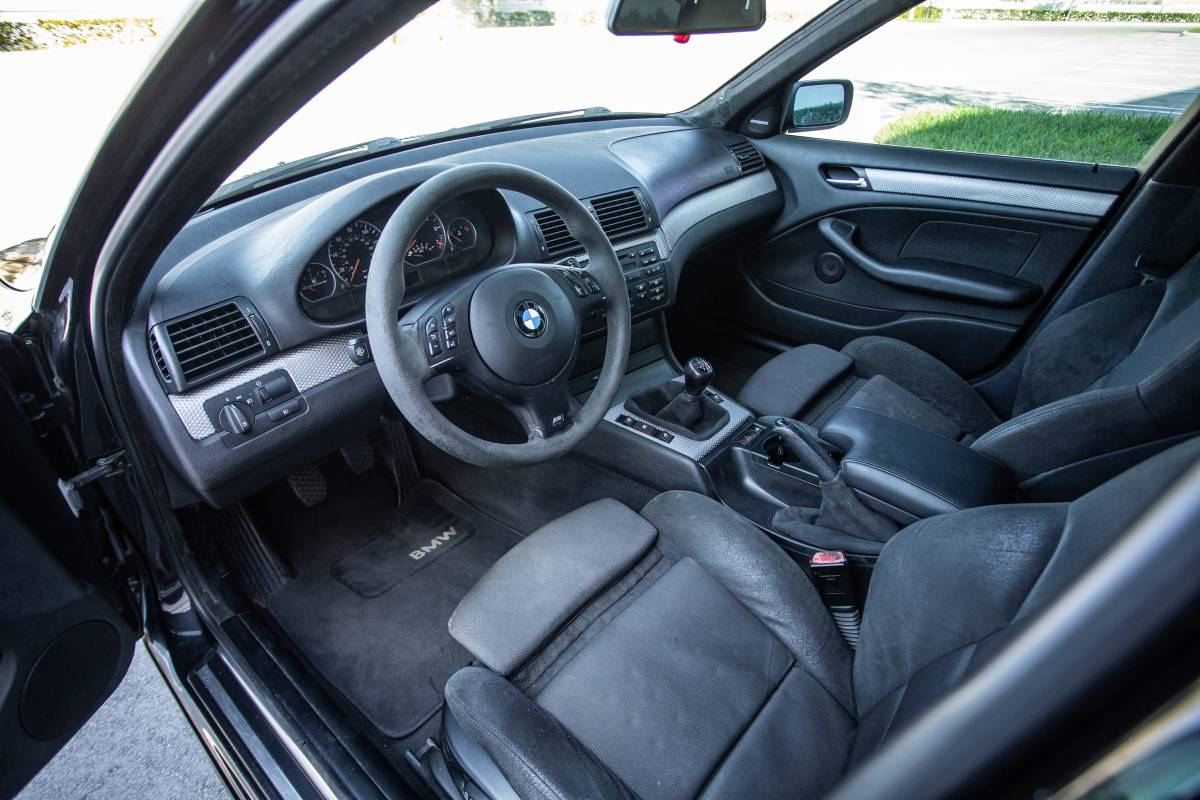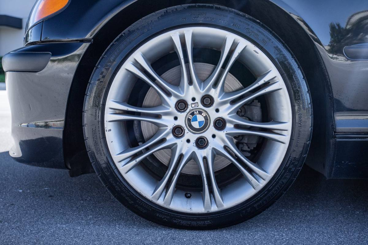 That's notable here, as the three-spoke sport wheel looks a little less tidy than the rest of the interior. The sport buckets also show some wear, but amazingly for their age, there's no apparent major damage or discoloration. The dash and door cards look to be in great shape too, as does all the switchgear. The exterior is clean and notably, has perfectly clean headlamp lenses, a common bugaboo on E46s. Aside from some obvious aging in the black plastic trim, and some marring in the allots it's all very acceptable.