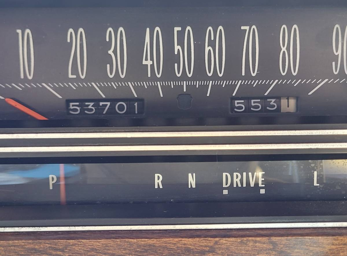 All the wood trim in here is fake, but the '70s luxury vibe given by that, paired with tons of chrome trim and puffy seats and door cards is as real as you could want. There are also lots of amenities to be had, including automatic climate control, cruise control, plus power windows and locks. The car even comes with what looks to be the original Cadillac crest floor mats. And, of course, there's a column shift freeing up the transmission hump for the wide split-bench front seats.