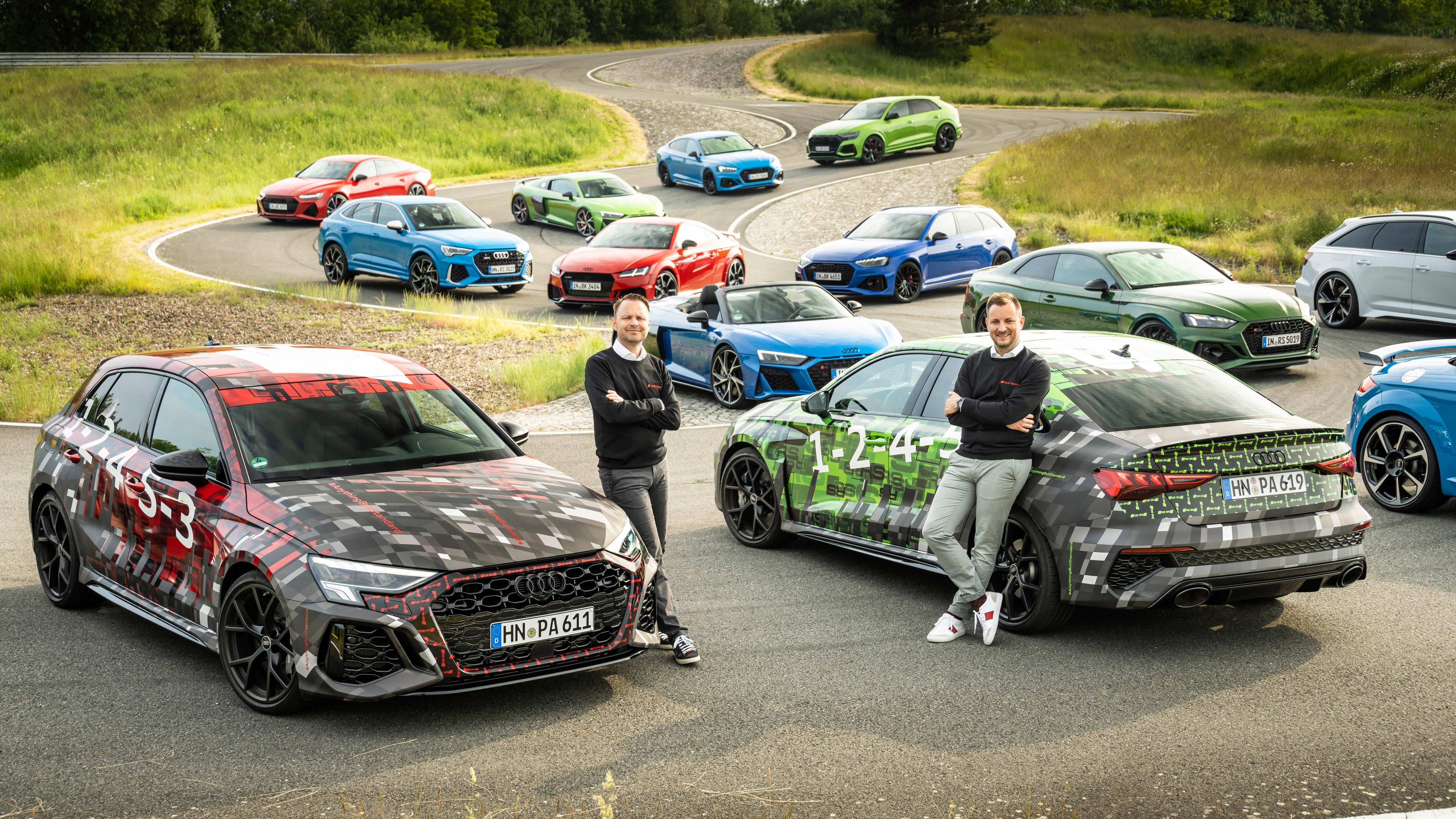 In Audi's annual sustainability report, it included a "family portrait" of all the cars it currently offers, with two wild models sitting front and center in factory camo. Hey, those look like RS3s!