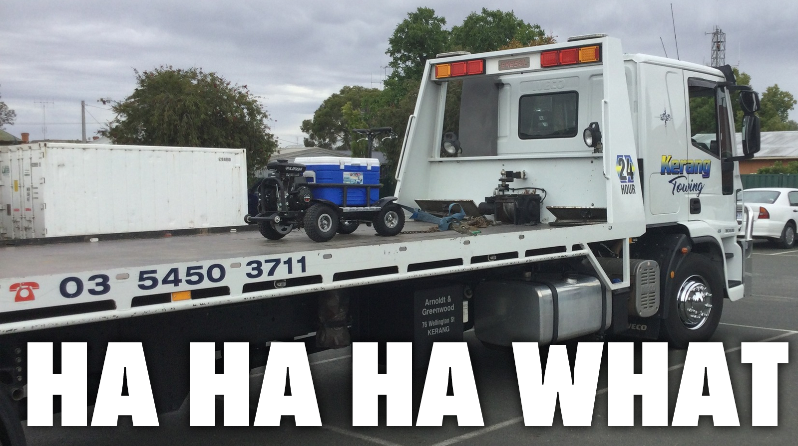 I'm not sure if you're aware of this, but motorized, ridable coolers are very much A Thing. There's multiple companies building and selling plastic coolers mounted on a frame with wheels and a lawnmower-type engine that you can sit on and drive around, a fact that will sure swing the balance in our favor when humanity is inevitably placed on trial by some powerful, judgy aliens. In Australia, though, it seems to be illegal to ride one on a footpath, and if you do that, the cops will impound your cooler by hauling it away on a comically massive flatbed tow truck. At least, that's what happened recently in Australia.