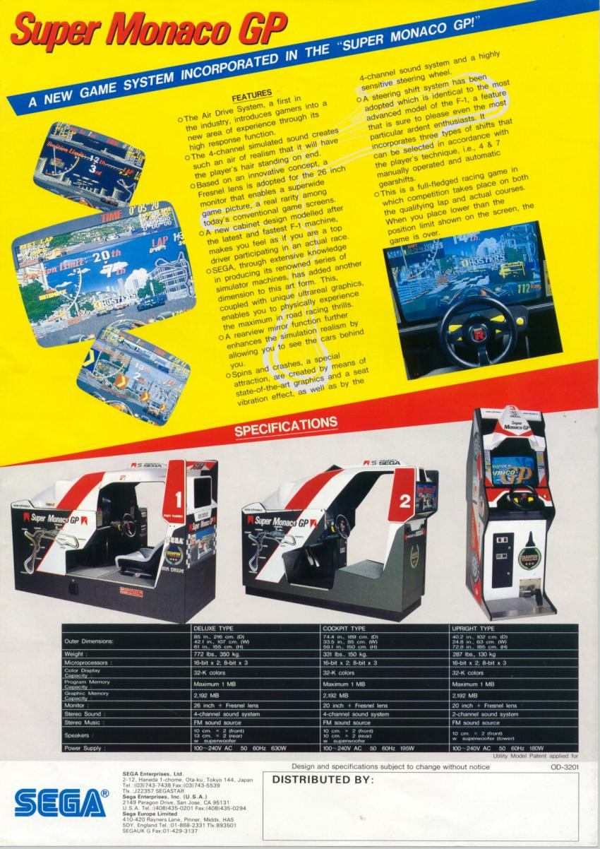 The original Super Monaco GP is a really beautiful game, in that it arrived at the peak of Sega's sprite-scaling supremacy. Before the days when 3D polygonal games were possible, Sega mastered the art of layering, rotating and scaling a high quantity of 2D graphics with such speed that it created the illusion of perspective. Think Out Run, but with an even more dizzying barrage of visual information. Super Monaco GP also had that eye-catching cabinet, styled to look like a McLaren Formula 1 chassis from the time.