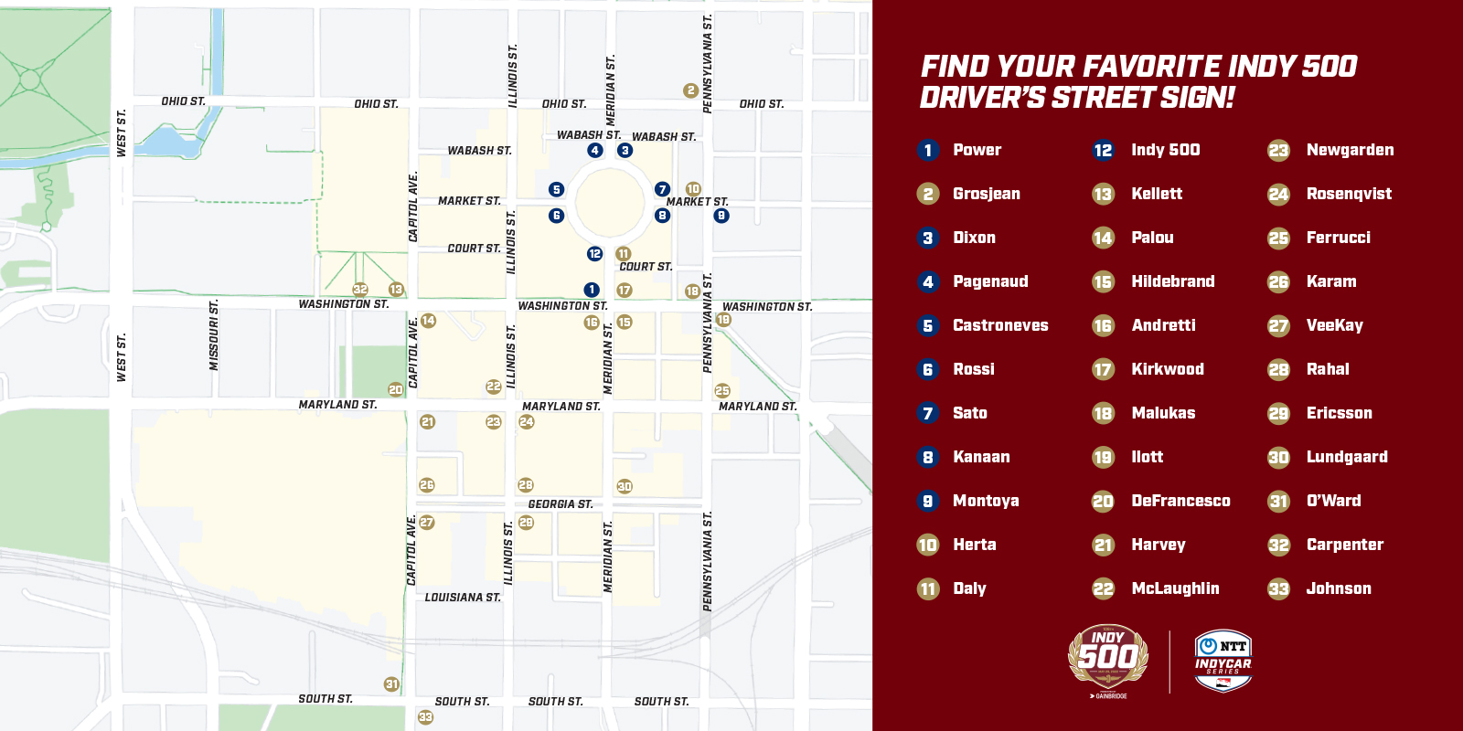 Each year, different streets in downtown Indianapolis are temporarily renamed after all 33 drivers that will take the green flag on race day. If you're an avid race fan, it can be a lot of fun to wander the streets and pose with your favorite driver's sign.