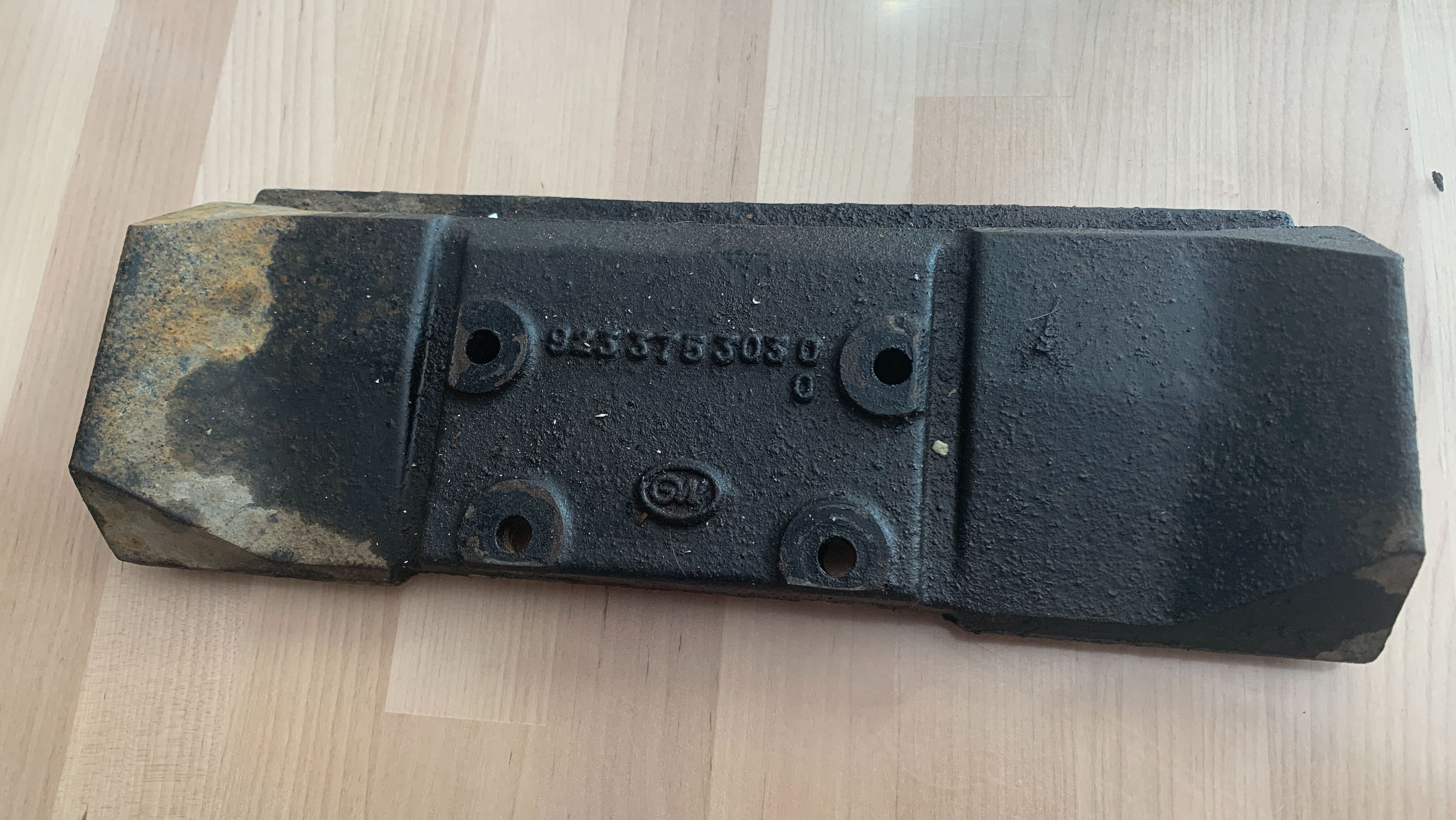 Porsche chose to add this weight at the lowest point of the drivetrain, the underside of the transmission crossmemeber. Of course, that meant it occupied the same space that the 911's rear sway bar wanted to occupy. To solve this issue, 912Es optioned with rear sway bars were equipped with a special sway bar with a kink in it to clear the weight. The part isn't even listed in Porsche's parts catalog from the era, and was probably installed at the dealer when the car was delivered, so finding one is about as close to impossible as it can get.