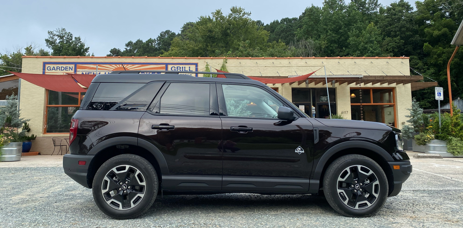 I was actually lucky enough to have my press loan divided between two Bronco Sports, like a freaking millionaire, one of which was this red-and-black First Edition one with a fun stripe kit that you see above. The other was this sort of metallic eggplant-colored Outer Banks edition one: