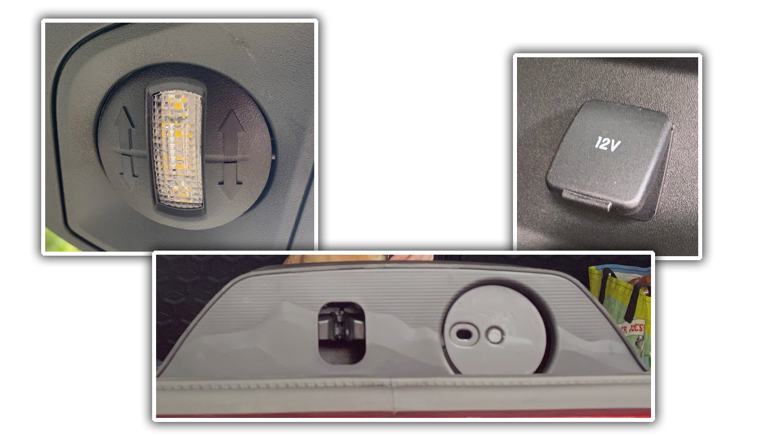 The rear has some other nice details, including a 12V outlet, a little directional light, and an easter egg of a mountainscape, but this is the best part of the rear cargo situation: