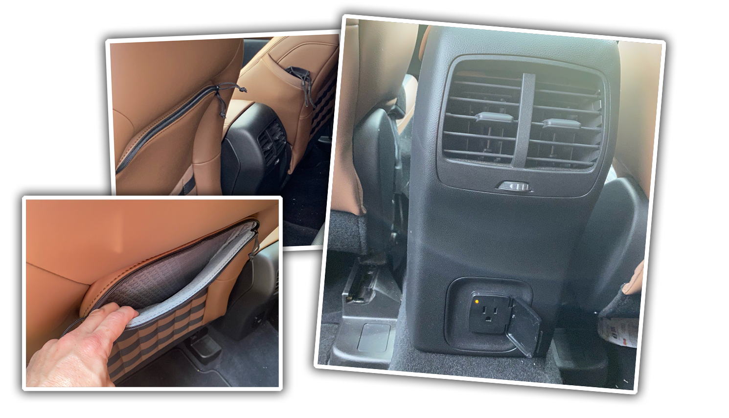 The seats are comfortable, and have handy little side pockets and even a zippered pouch on the backs of the front seats for laptops or tablets. Also, there's a 110V wall-type power outlet in the rear under the rear HVAC vents so you never have to go on a road trip without a working Vegimix ever again.