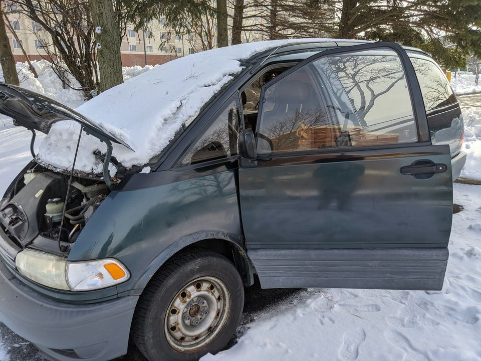 I've been waiting for one of these to show up for pretty cheap. Don't let these pictures deceive you — we've been getting so much ice and snow in Illinois — because this is a running rear-wheel-drive and supercharged minivan. It has some wear but the owner says it's ready to go to a new owner. With a little negotiation you may even get the parts needed to fix it. It's a super weird van for little money, so what's not to love?