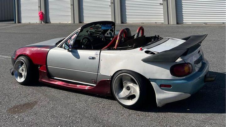 Have I ever mentioned that I love absolute garbage drift cars? Real missiles with mismatched body panels, bent frames, and the dumbest stickers and body kits you've ever seen? Well, I do, and this Miata counts.
