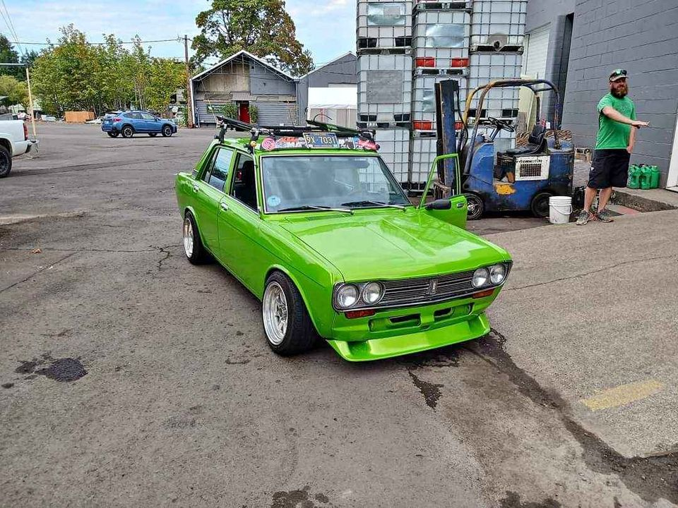 I can spend all this time talking about the colors because I don't need to sell you on the car. It's a bright green Datsun 510 four-door with perfect wheel fitment and a roof rack — what else do you need? I assume you sent an offer upon seeing the image, and are only coming back to read this now that you've arranged a pickup with the seller.