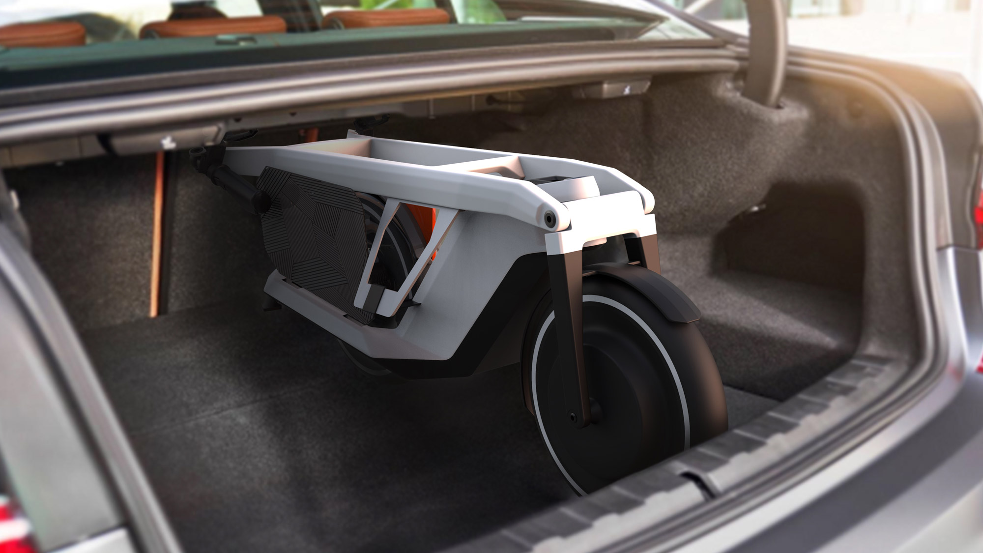 The Clever Commute on the other hand is more of a conventional e-scooter. It can fold down to stow away when not in use, though lots of scooters can do that. BMW's approach is particularly good at minimizing itself because the footboard folds at its sides as the rear wheel retracts underneath, shortening the wheelbase enough so that the whole thing can fit on the step of an escalator length-wise, or in the back of a BMW 3 Series or even a Mini's hatch. The hub motor integrated within the front wheel also provides some assistive power when pushing the scooter up inclines.