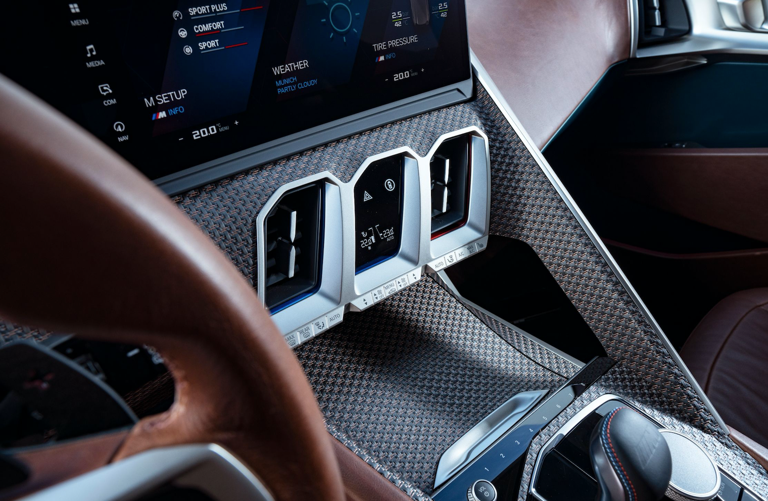 The cockpit features the huge, curved LCD dash display that we've seen on BMW's electric iX SUV already, but plays more with interesting materials, like this: