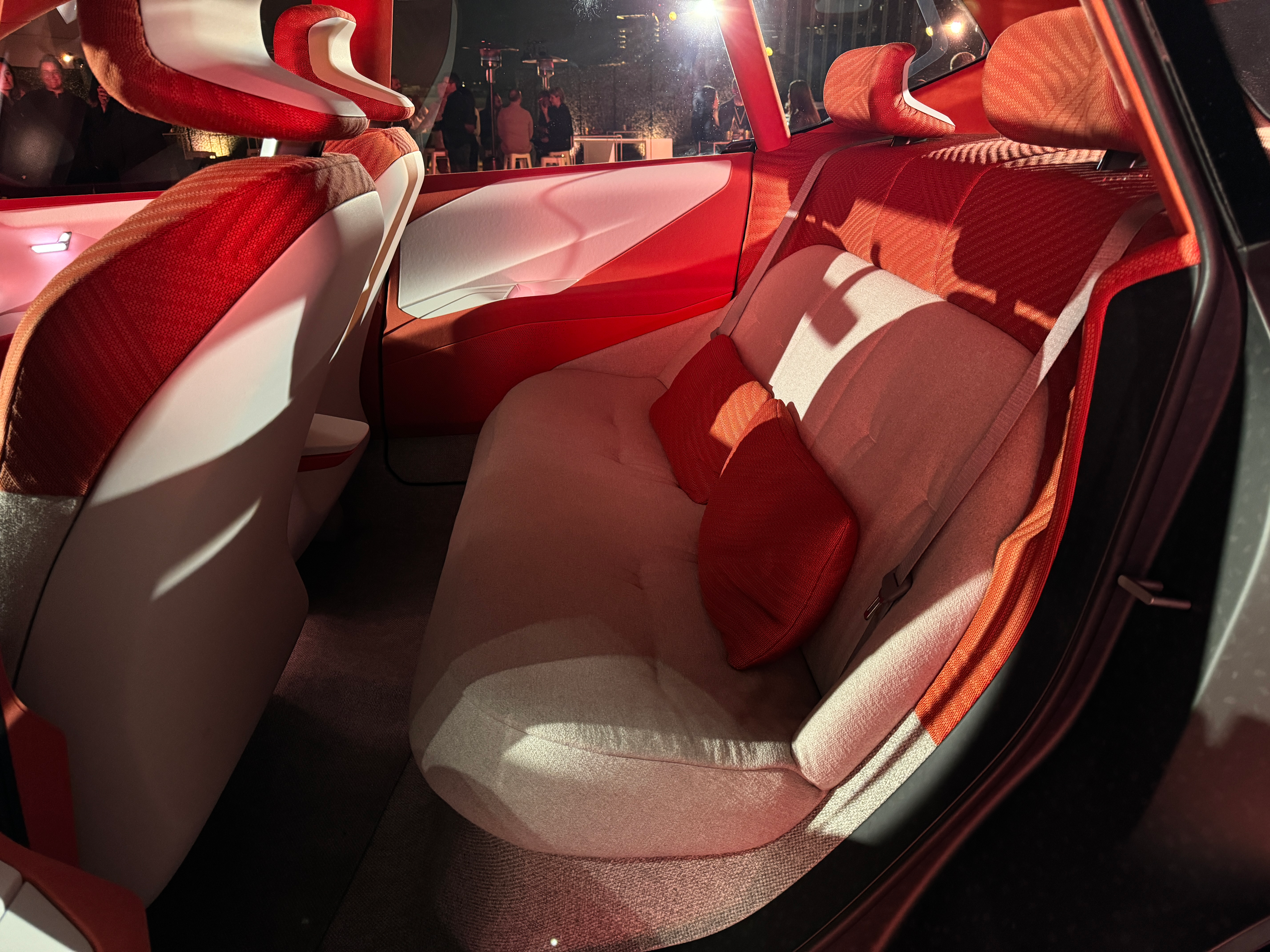 The lounge-like back seat is where you really want to be. The bench is wonderfully padded and has a design that looks like the best mid-mod furniture — pillows included. It's super comfortable, and there's tons of room to spread out despite the Neue Klasse X not being that much bigger than a current X3 on the outside.