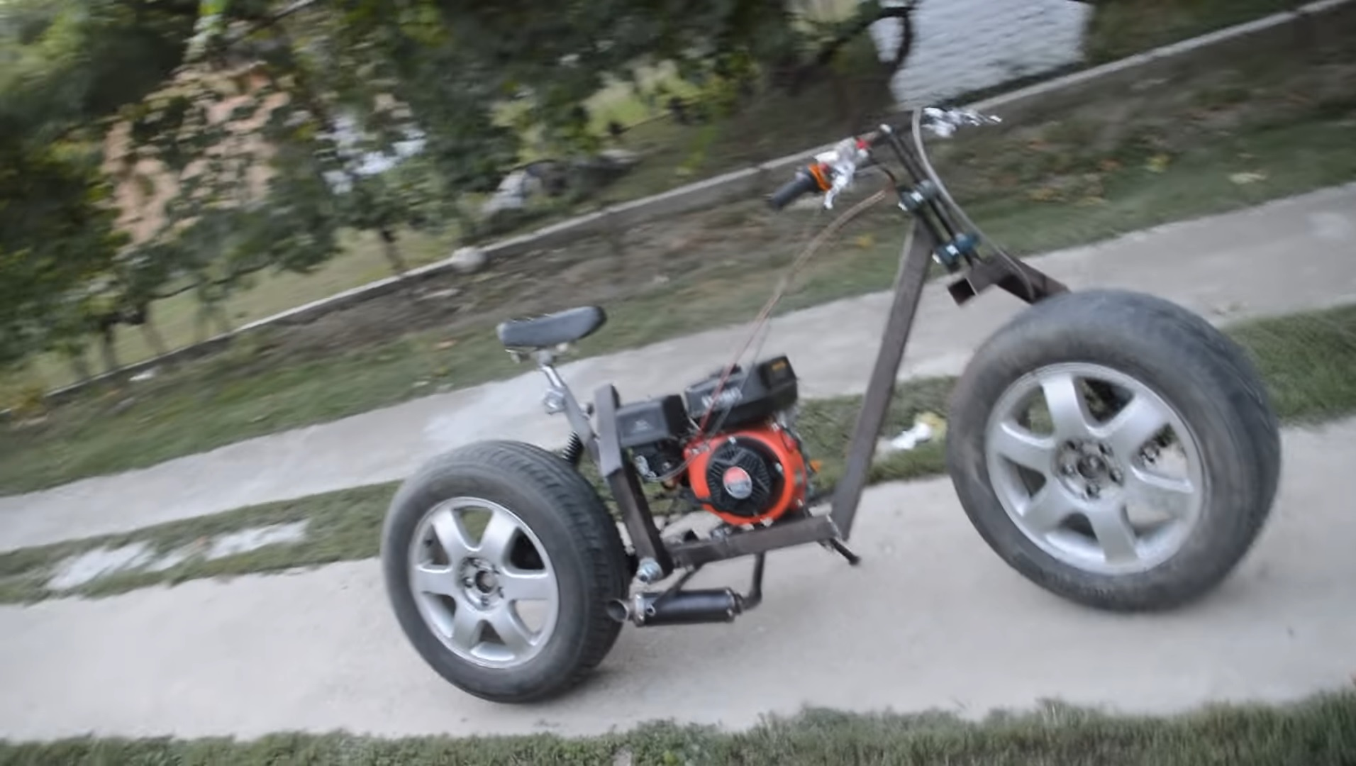 With some proper motorcycle wheels, some kind of chain guard, and routing the throttle and brake along the frame where they should be, and this little homemade two-wheeler might actually be pretty good to ride around for a while. The motor mounted on the frame is apparently a 208cc job, which should be more than enough power to move a human down the road at a reasonable clip. Comparable 208cc engines generally provide around 5.5 to 6 horsepower.