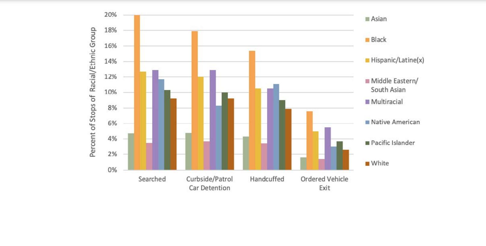 The data then delves into what happened during various stops. The numbers show an interesting and obvious bias. While individuals perceived to be White (30.7 percent) and Hispanic (42.4 percent) were stopped more often than those who were perceived to be Black (15 percent), Black people were more often to be detained or searched. And again, the numbers show it.