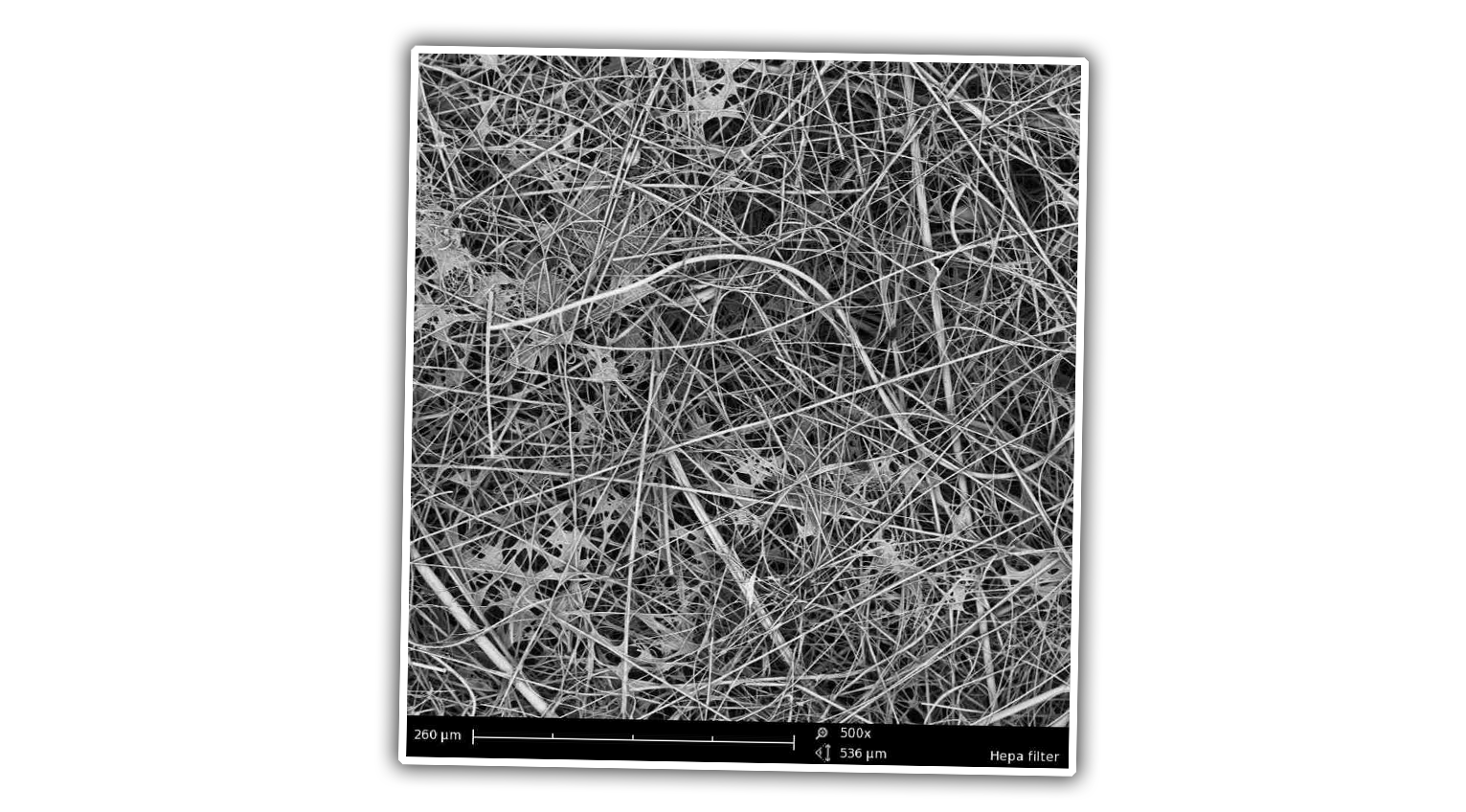 ...a big random tangle of fibers. The air goes in, and the particles get trapped in the disorderly mesh, and as a result, never get to your lungs to cause trouble.